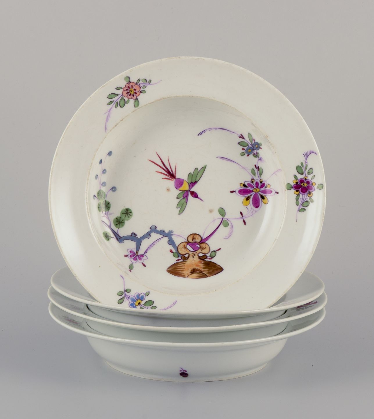 Meissen, Tyskland. Et sæt på fire antikke suppetallerkener af porcelæn.Håndmalet, ”Kakiemon” dekoration.