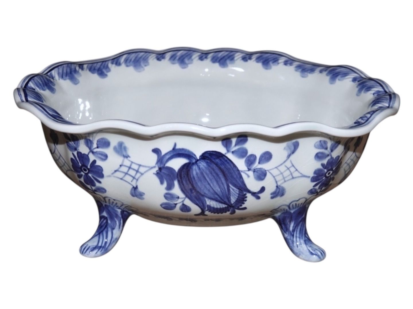 Aluminia Tranquebar, skål på fire fødder med sjælden set dekoration.Dekorationsnummer 3044/1048.