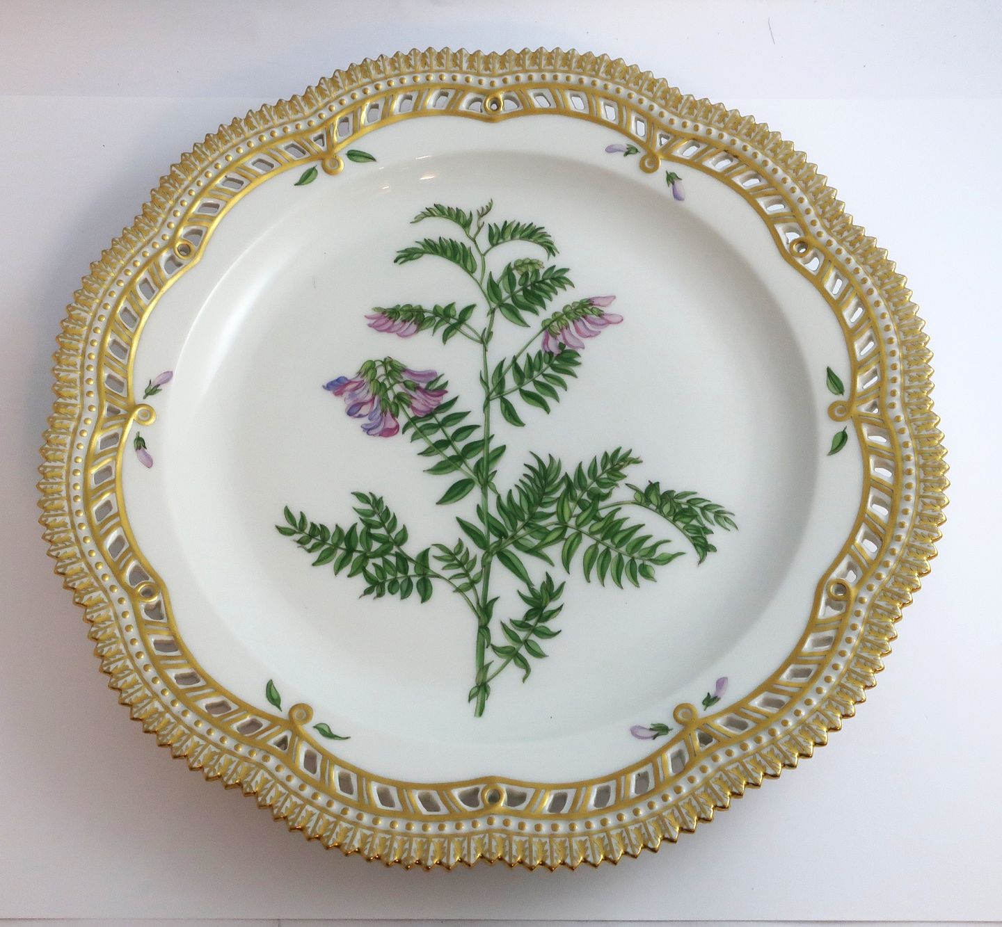 Royal Copenhagen, Flora Danica. Tallerken med gennemskåret bort. Design #3574. Diameter 29 cm. (1 sortering). Vicia Orobus Udstiller
