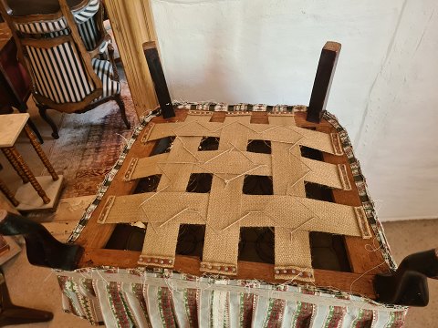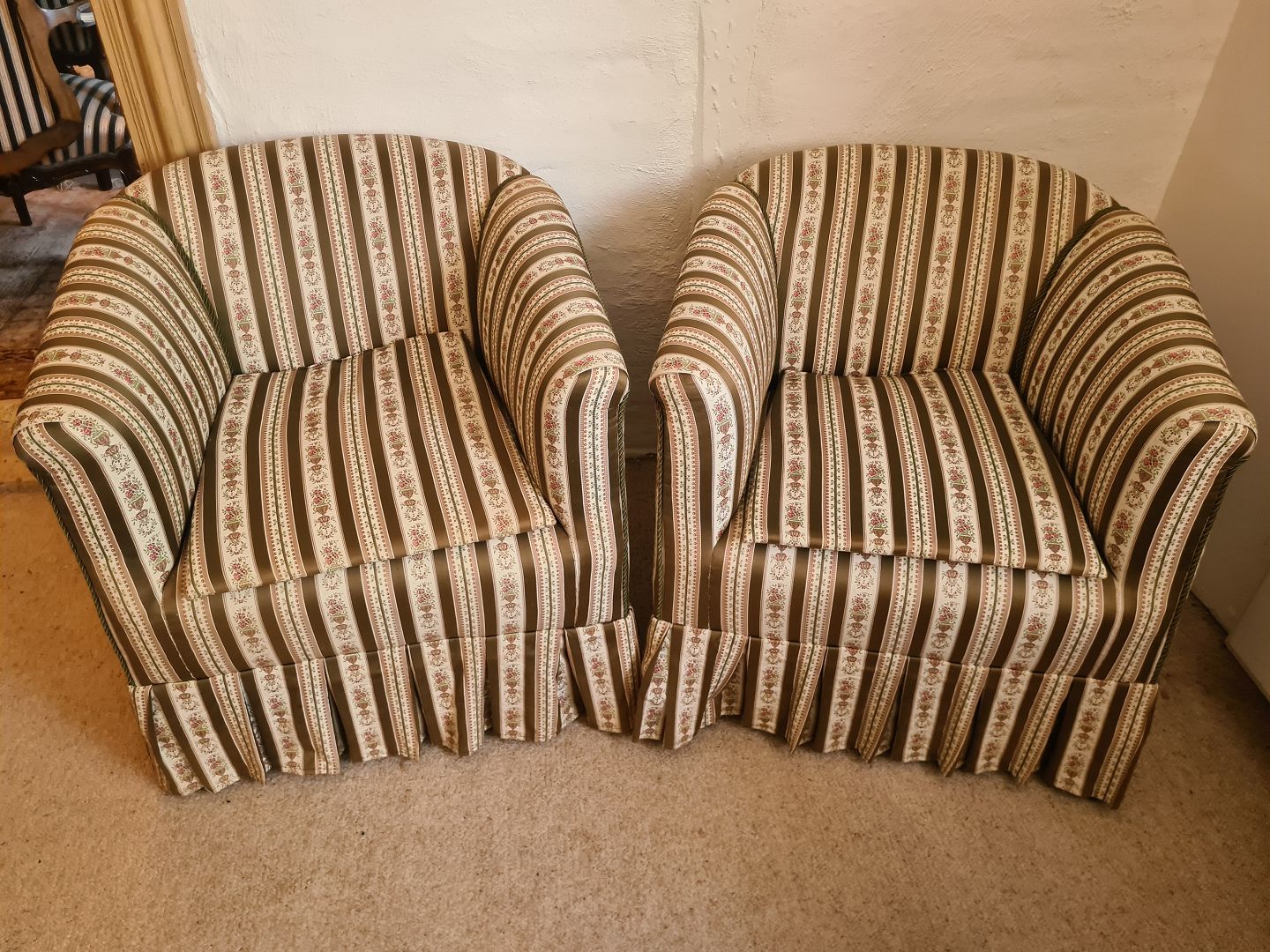 Par overpolstrede lænestole fra 1950'erne. Fremstår pæne og velholdte uden nævneværdige brugsspor.Højde 70 cm. Bredde 70 cm. Dybde 68 cm.