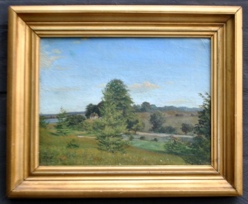 From, Heinrich Christian (1811 - 1879) Danmark: Landskab med hus ved sø. Olie på lærred. Signeret: Monogram 1877. 28 x 36 cm.