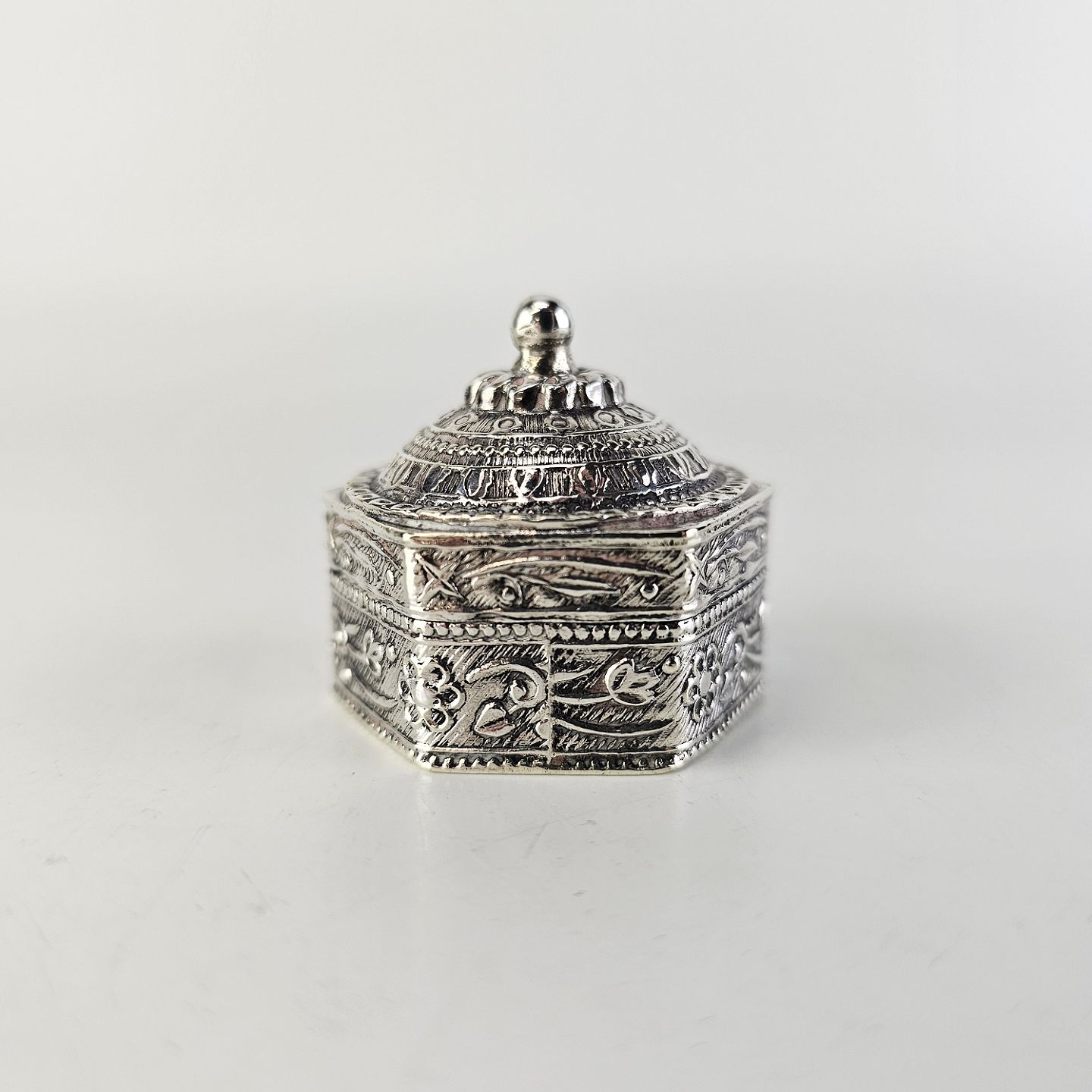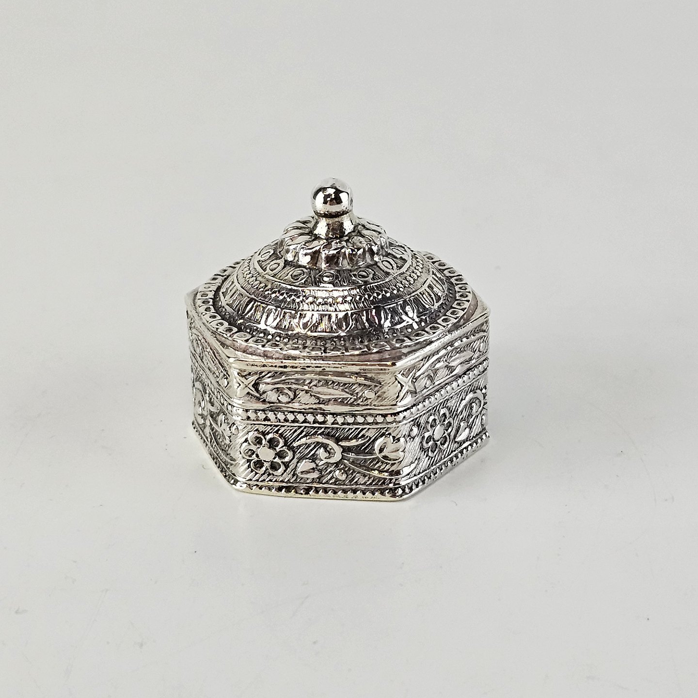 Lille dåse i sølv med koppellåg og dekoreret med blomsterrankerStemplet 800 under bunden