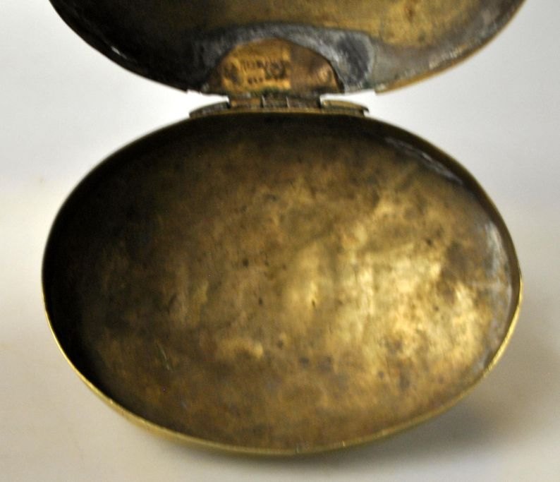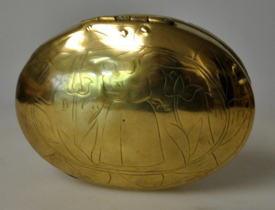 Hollandsk tobaksæske i messing, 1749. Med dekorationer i form af to kvinder og landskab med kirke. Oval med låg. Repareret. Med ejerinitialer og årstal.: 1749. L.: 11 cm.Emne nummer: 1447