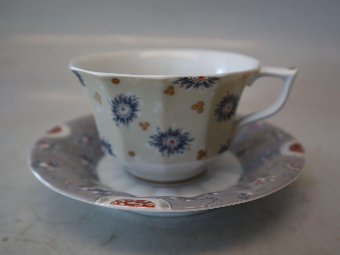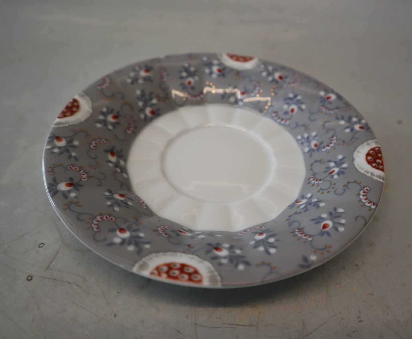 8 sæt på lager grå072 Kaffekop 15 cl og underkop 073 13,7 cm (8608) . Royal Copenhagen Fairytale. Inspireret af Gerhard Hennings figurer af samme navn. Et kompleks flerfarvet transfer mønster på den kantede form som Blå Blomst Kantet. Design Finn Næss-Schmidt og Jørgen Nielsen. De grå dele har nummer 1201, terrakotta 1202 og serveringsdele med lidt af hvert 1203.