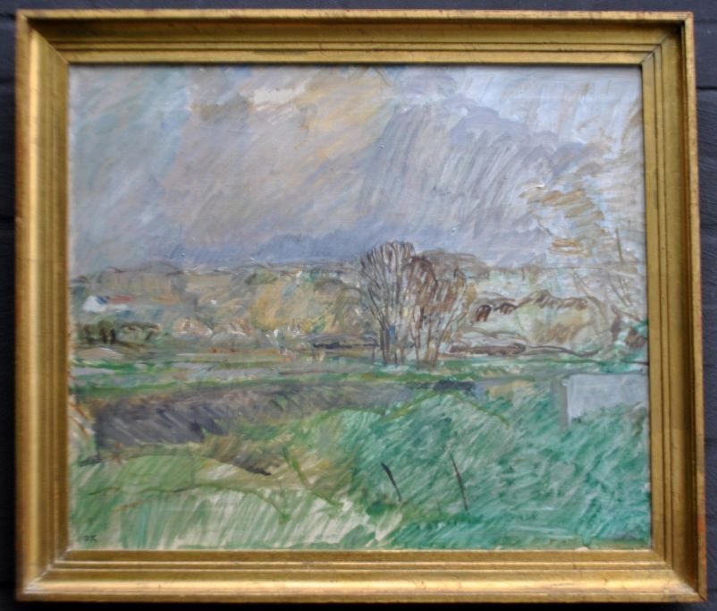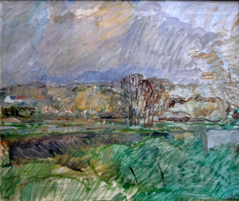 Kielberg, Ole (1911 - 1985) Danmark: Majlandskab - Daugløkke, 1962-63. Olie på lærred. Signeret: OK. Signeret bagpå: Ole Kielberg Daugløkke 1962-3. H: 46 cm. B: 55 cm.