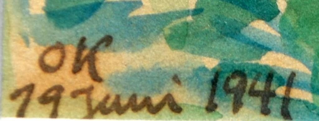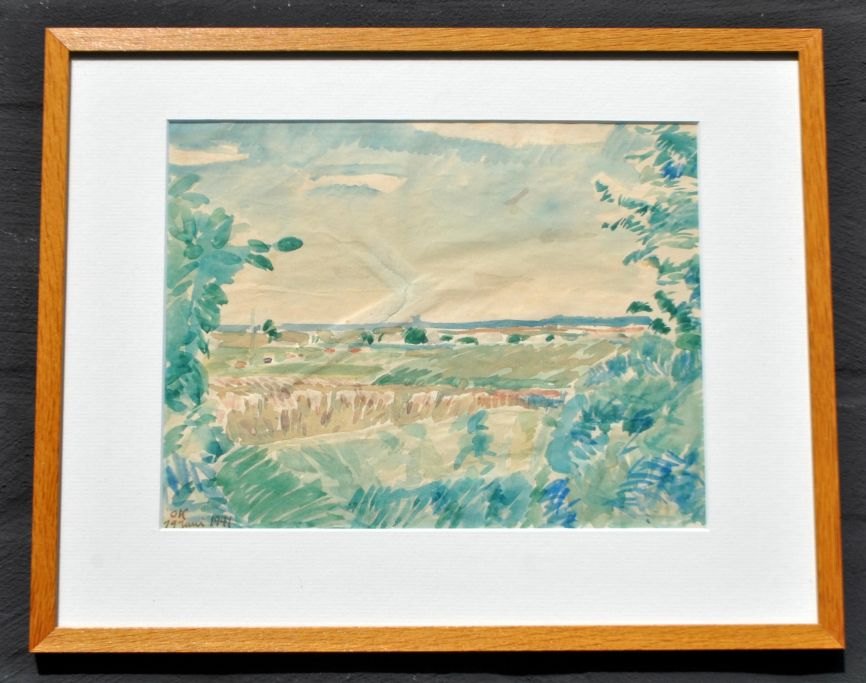 Kielberg, Ole (1911 - 1985) Danmark: Mark landskab, 1941. Akvarel på papir. Signeret: OK 19 juni 1941. H: 20,5 cm. B: 26,5 cm.