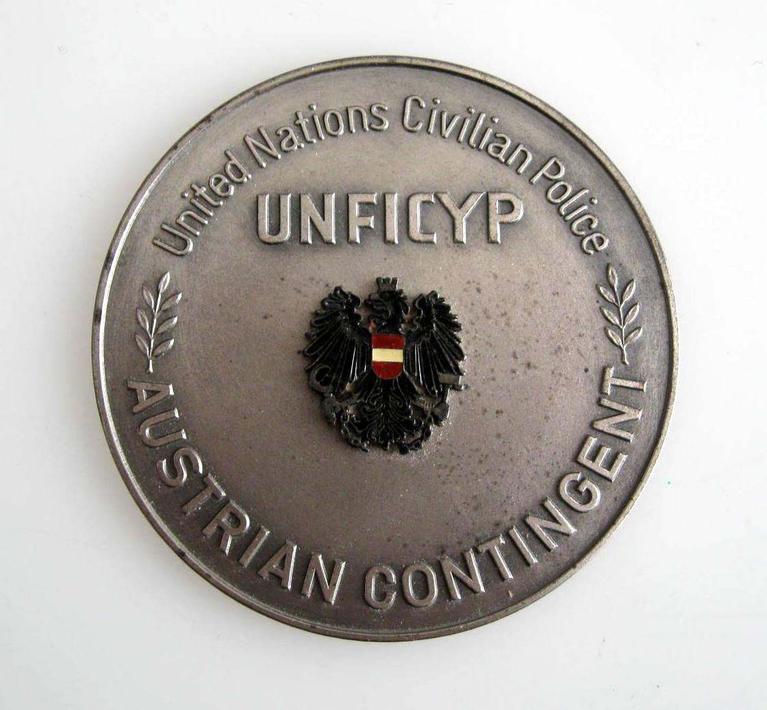 FN medalje - United Nations Civilian Police - Unficyp. Austrian Contingent. Dia.: 7,5 cm. Metal med emalje. Med inskription.: Lt. Col. P.E.P. Skov CO DANCON zur freundlichen Erinnerung, CYPRUS 1971. I orignial æske. Proveniens: Oberstløjtnant Poul Ervin O. Skov, Øverstkommanderende Dancon XIV, Cypern.Emne nummer: 5425