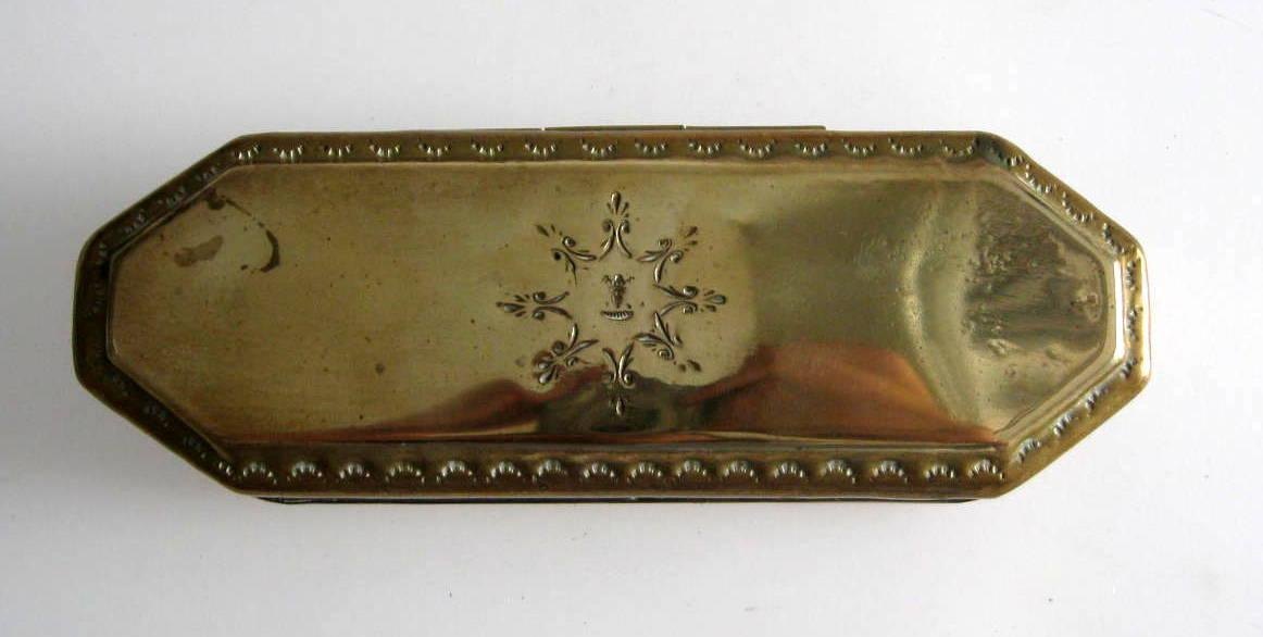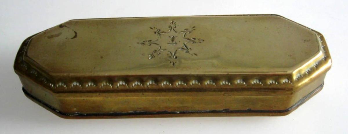 Snustobak dåse i messing, 18. årh. Ottekantet. L.: 15 cm. Dekoreret med fleur de lis og ansigt med krone.Emne nummer: 6956