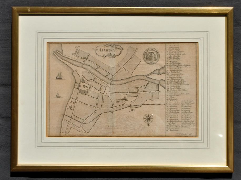 Topografisk kort over Aarhus, 1767. Danmark. Kobberstik. H. C. Cramer. 20 x 32 cm.Indrammet: 35 x 47 cm.