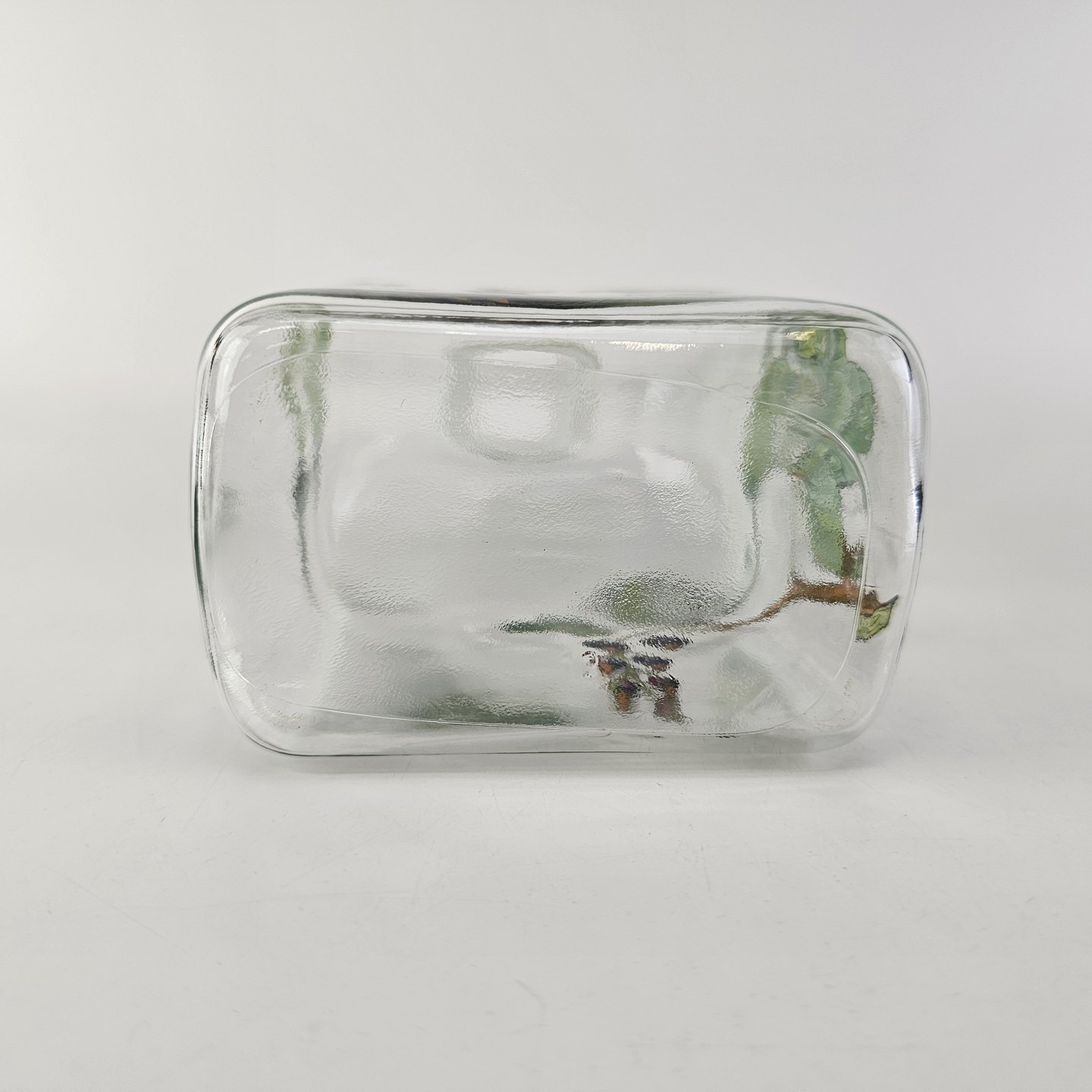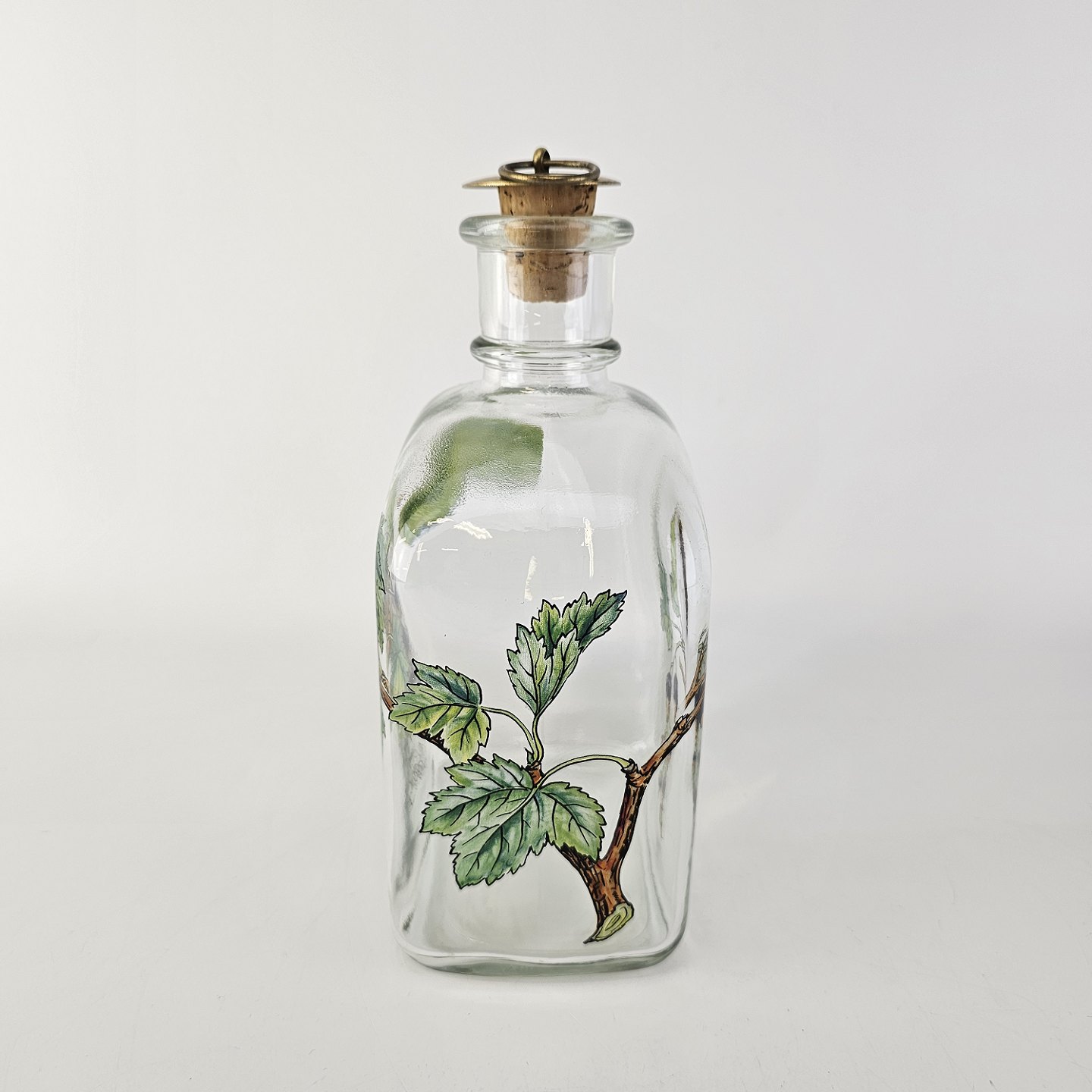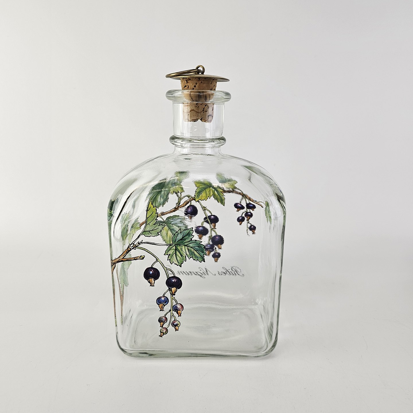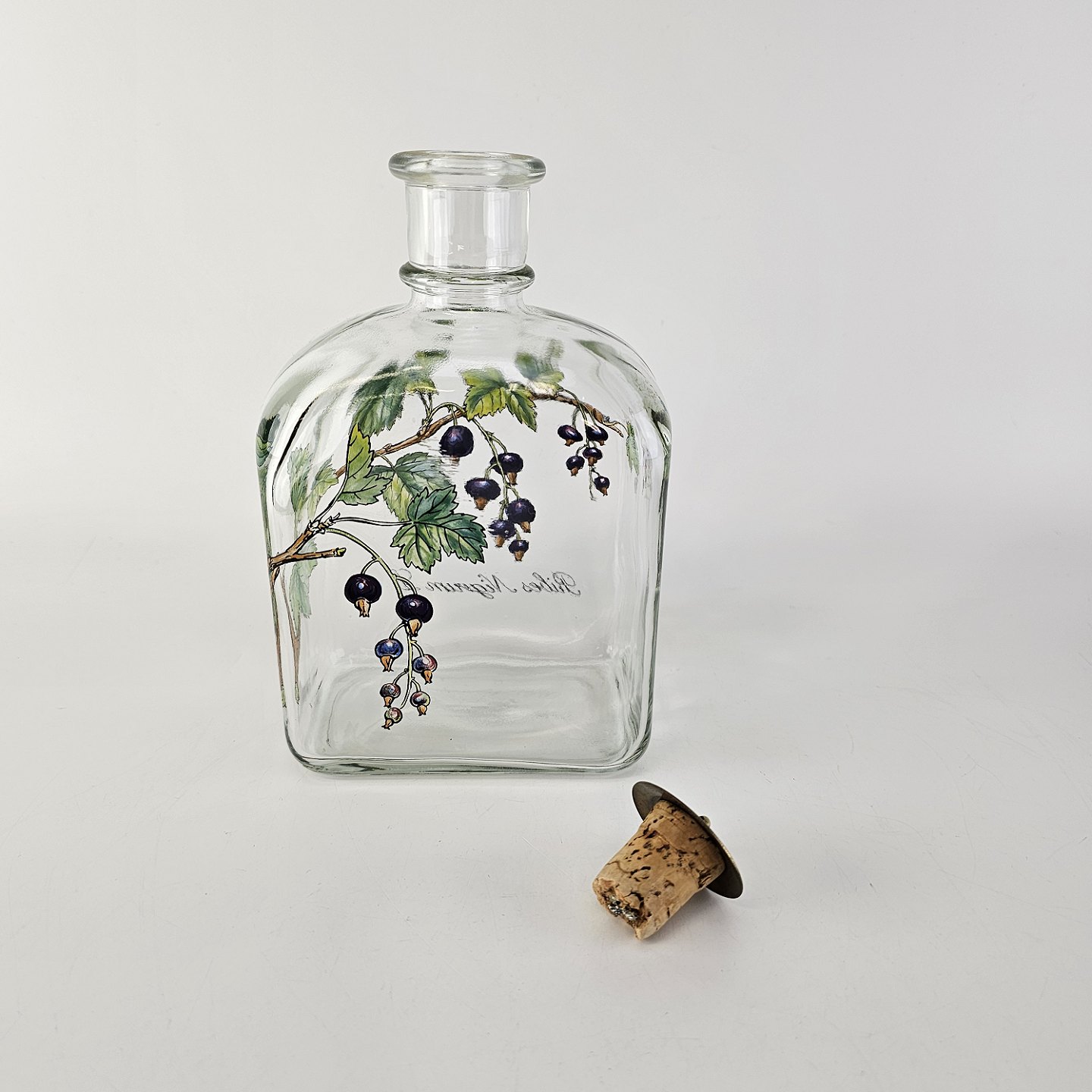 Karaffel i klart glas med korkprop fra serien Brændevins Amatøren, dekoreret med en gren af solbær og teksten Ribes Nigrum L.Formgiver Finn Clausen / Michael Bang