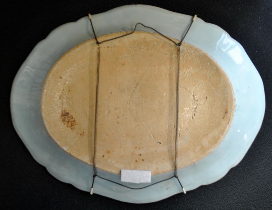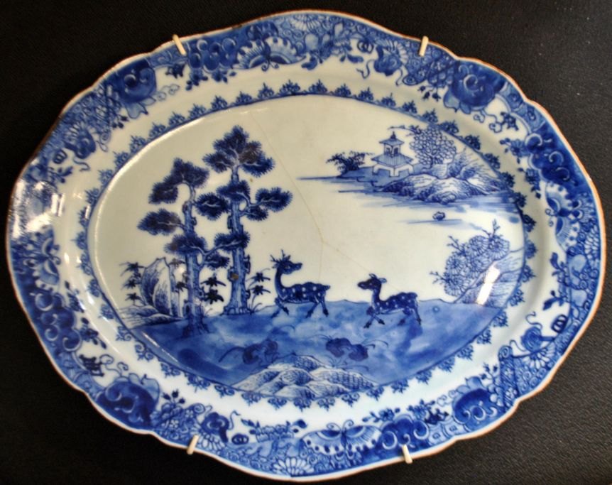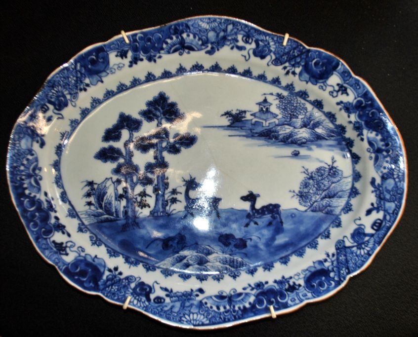 Kinesisk blue and white fad, 18. årh. Med håndmalede dekorationer af hjorte i landskab. I baggrunden pagode. Rand dekoreret med blomster og sommerfugle. L.: 36,5 cm. B.: 28,5 cm.NB: Med hårrevne - ellers perfekt stand!