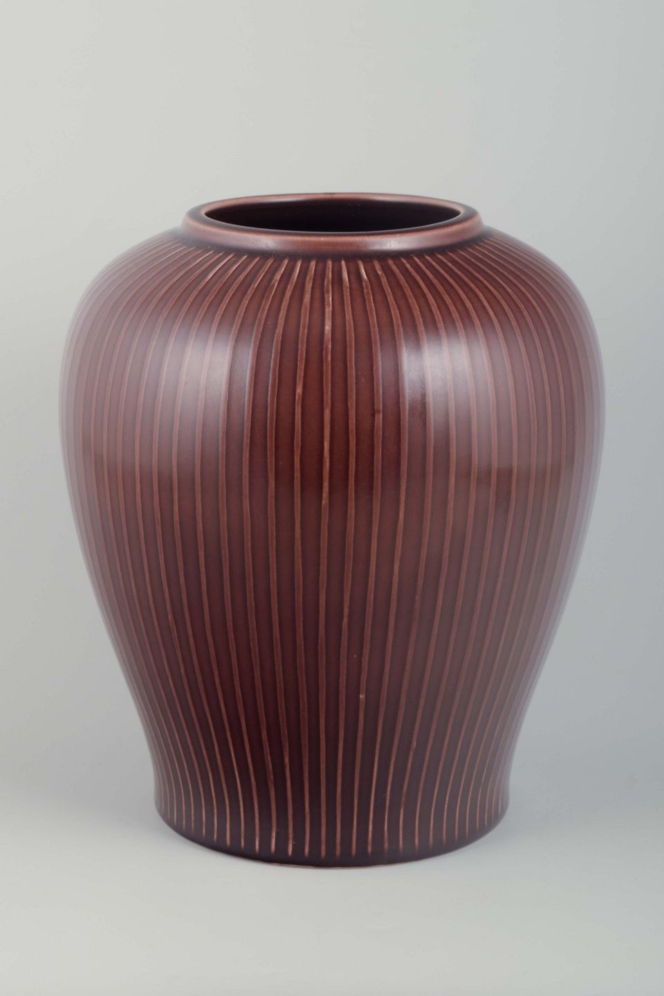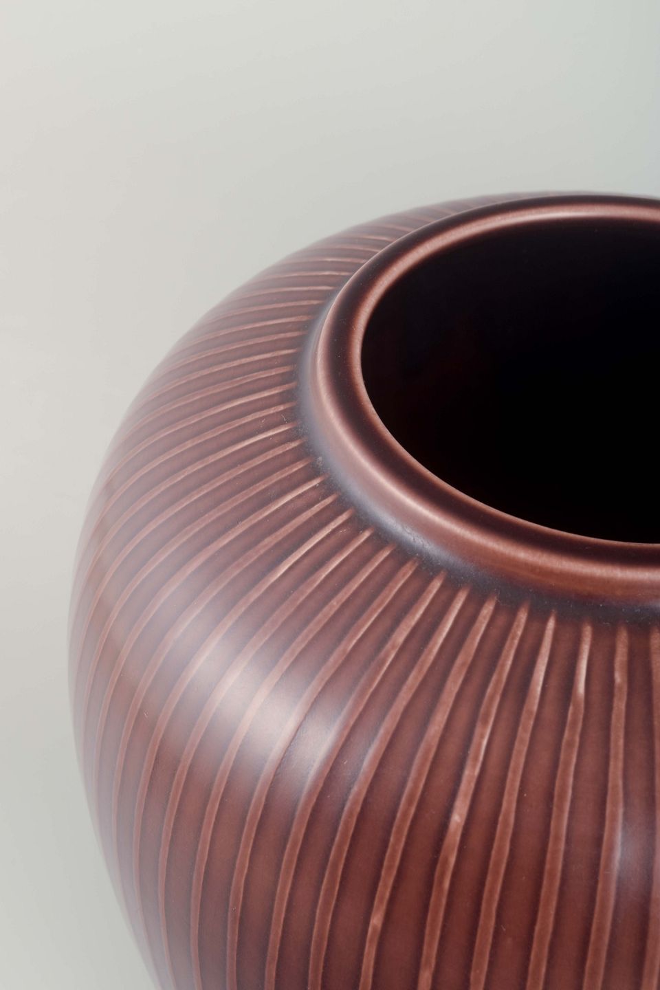 Aluminia "Marselis" stor fajancevase.Organisk formet vase i fajance med reliefdekoreret overflade og dyb burgundy glasur med lodrette riller, som fremhæver formen.