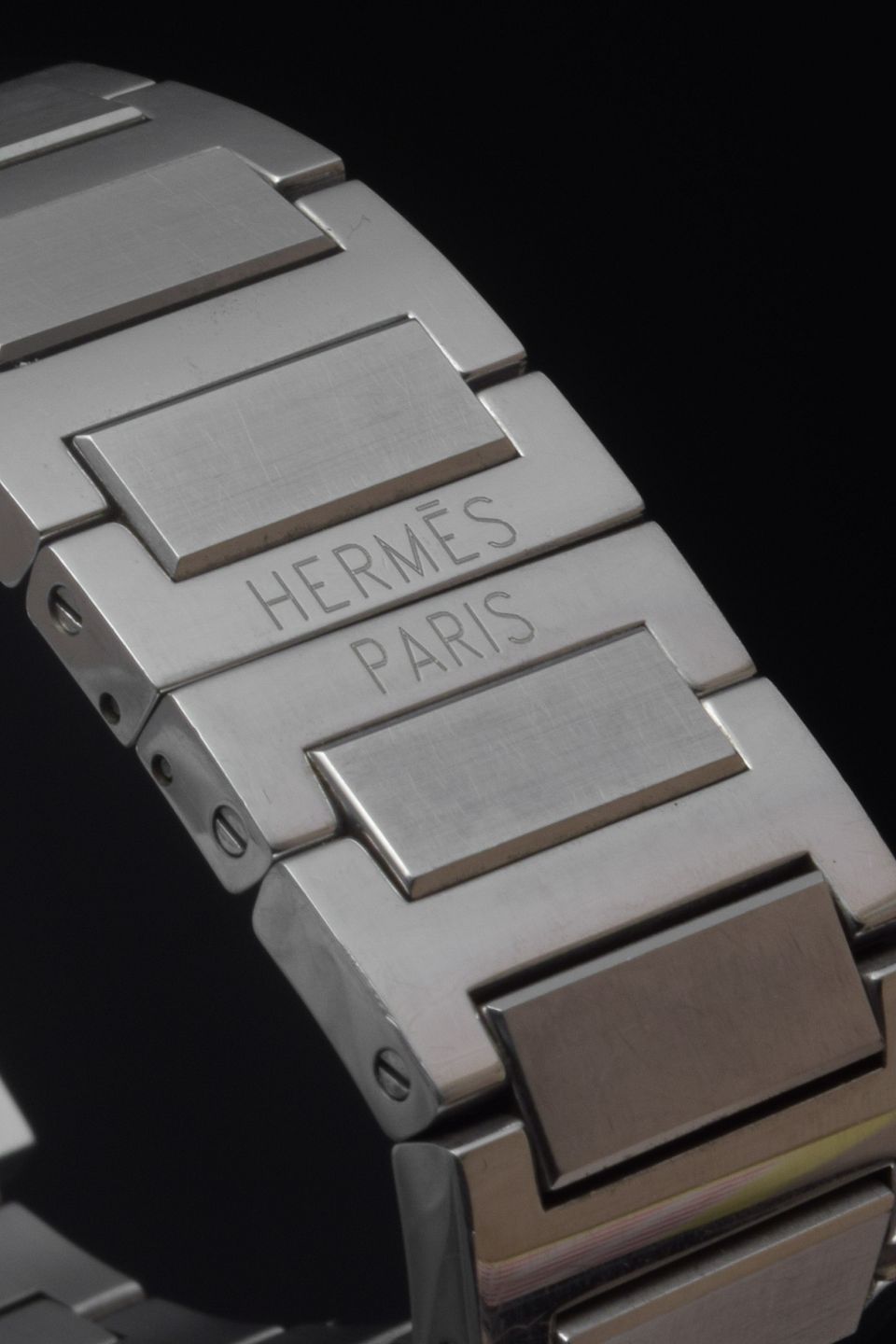 Hermès, grundlagt i 1837 i Paris, er internationalt kendt for sit udsøgte håndværk og luksusvarer inden for læder, mode og accessories. I 1970’erne begyndte Hermès at producere ure i Schweiz, kendetegnet ved kombinationen af fransk design og schweizisk urmagermesterkvalitet. Tandem-modellen, introduceret i 1990’erne og produceret ind i 2000’erne, udmærker sig ved sit moderne rektangulære design med integreret lænke og minimalistisk udtryk, som gør den til et tidløst herreur.