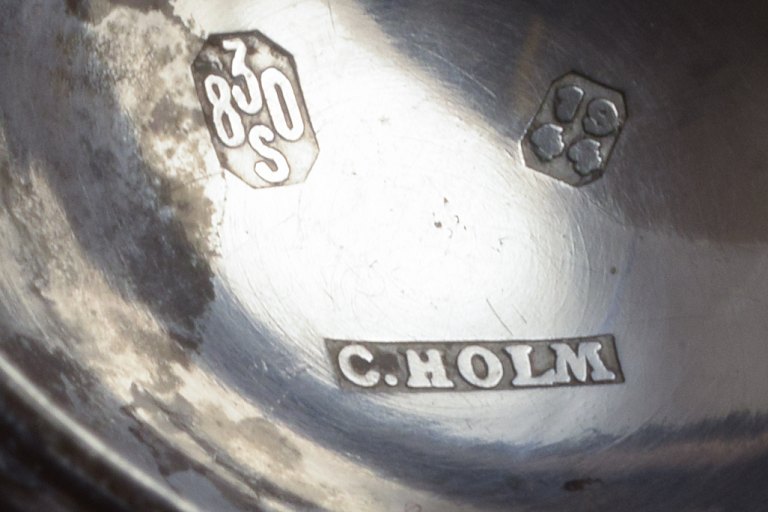 Stempler: “C. HOLM 830S” på låg, “Hans Hansen Denmark Sterling” på ske.