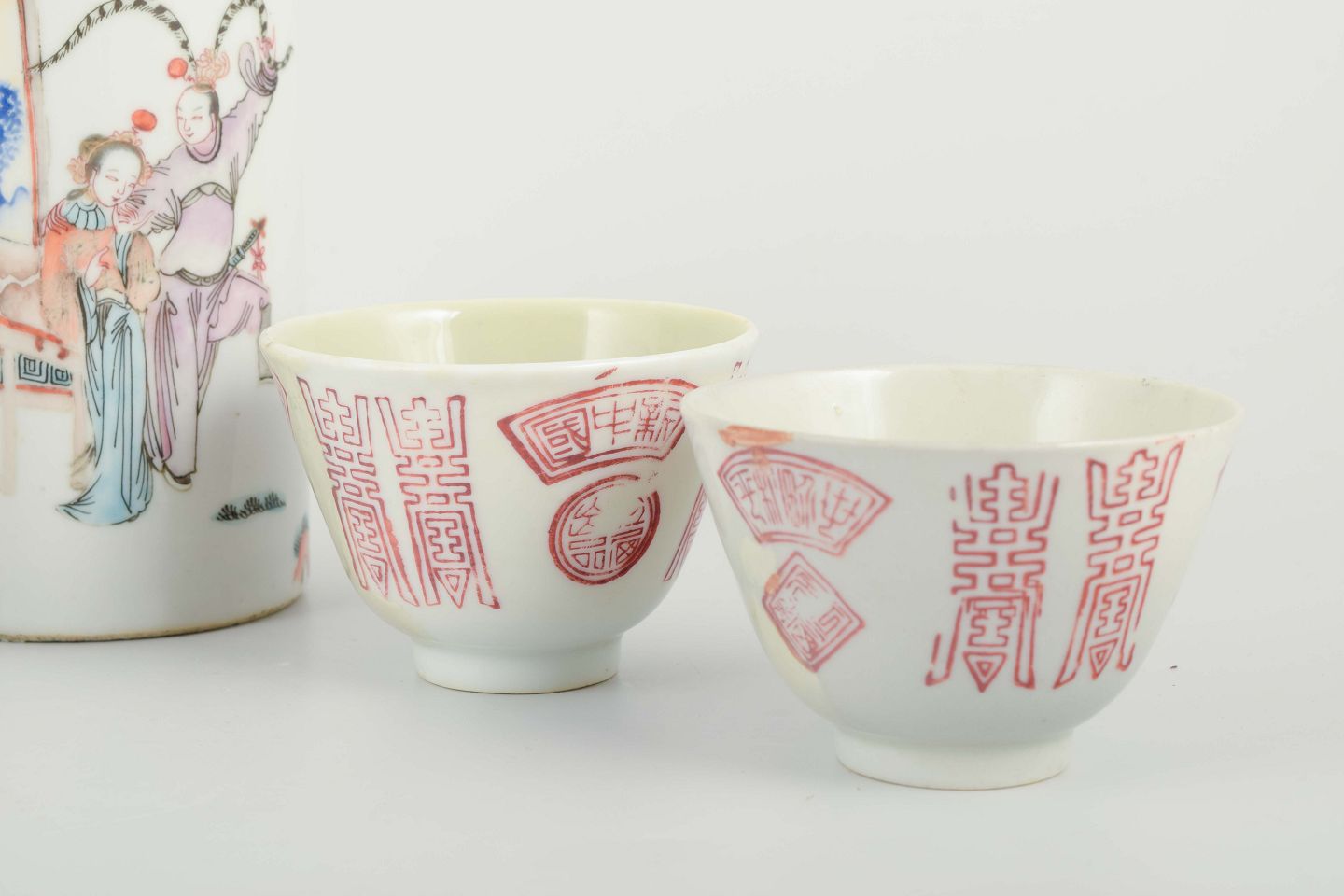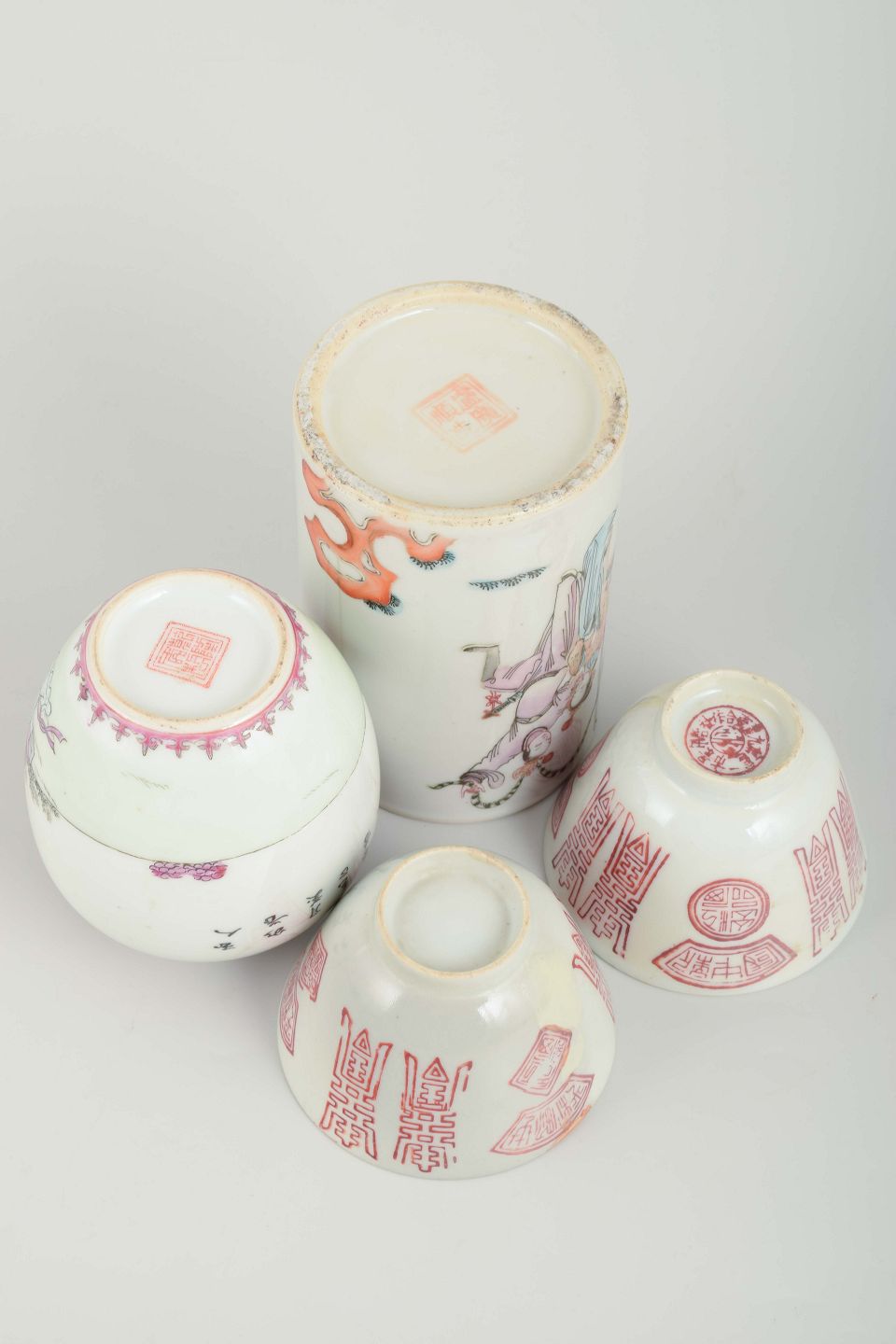 Kinesisk porcelæn fra 1900-tallet spænder over både traditionelle og mere folkelige dekorationer. Famille rose-paletten, introduceret i Qing-dynastiet i 1700-tallet, blev fortsat anvendt langt ind i 1900-tallet, ofte med motiver af figurer, blomster og symboler for lykke og lang levetid. De røde tryk med kalligrafiske tegn er klassiske symboler for held og dobbeltlykke, ofte anvendt ved ceremonielle sammenhænge.