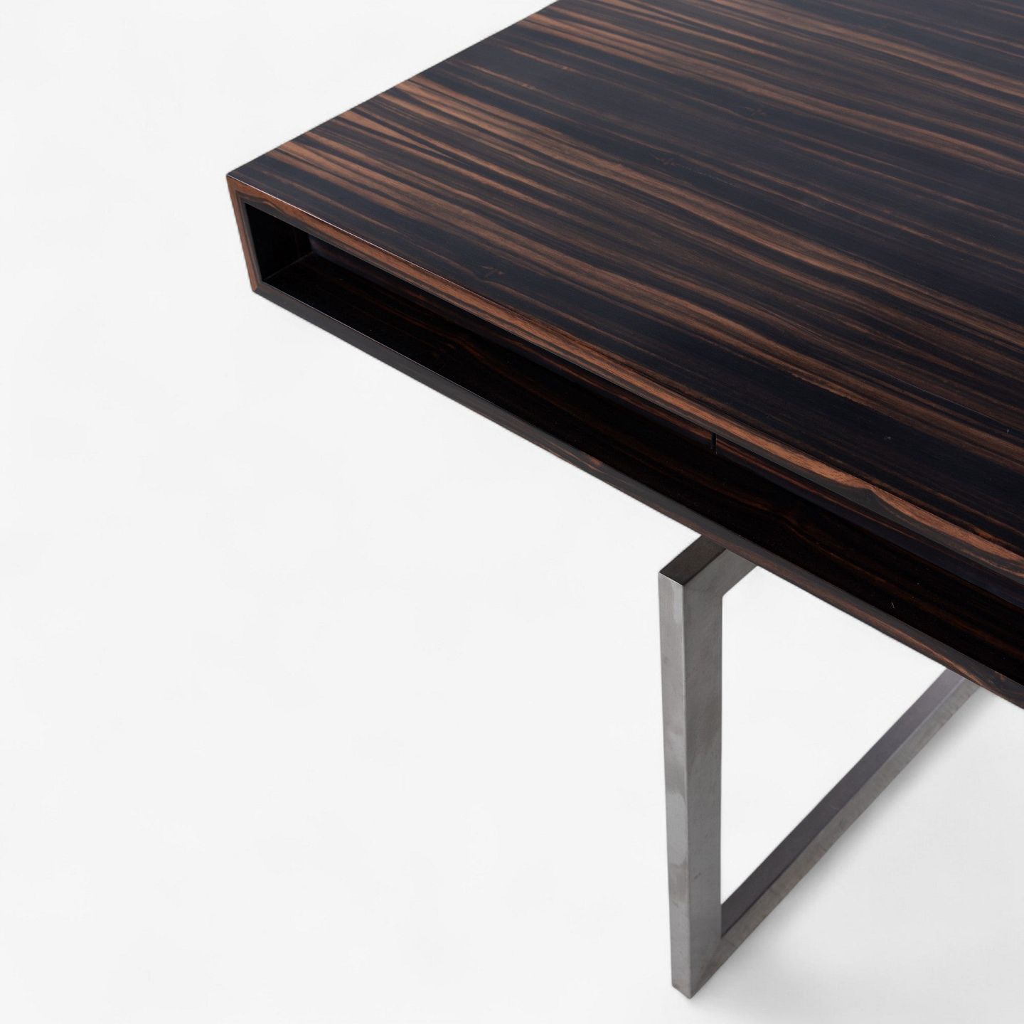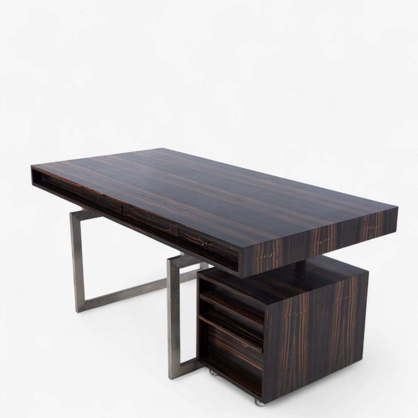 Skrivebord i valnød med fire skuffer, skuffemodul på hjul og stel i stål.