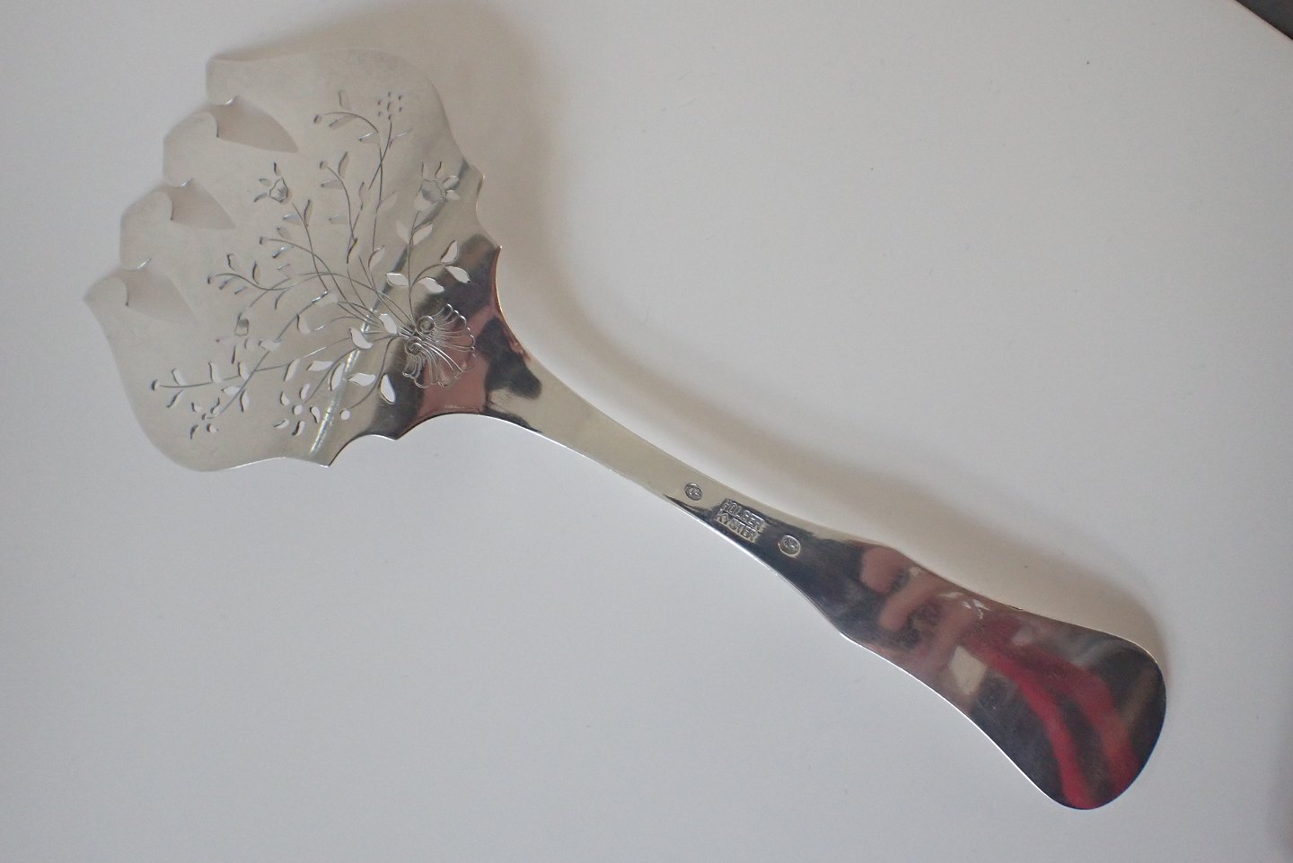 Holger Kyster (1898 - 1944) - fiskespade i 825 sølv med perforeret og påsat blomstermotiv. Stemplet Holger Kyster og 2 gange fuglen fra Kolding byvåben. Vægt 106 gram. Længde: 23,2 cm. Udstiller