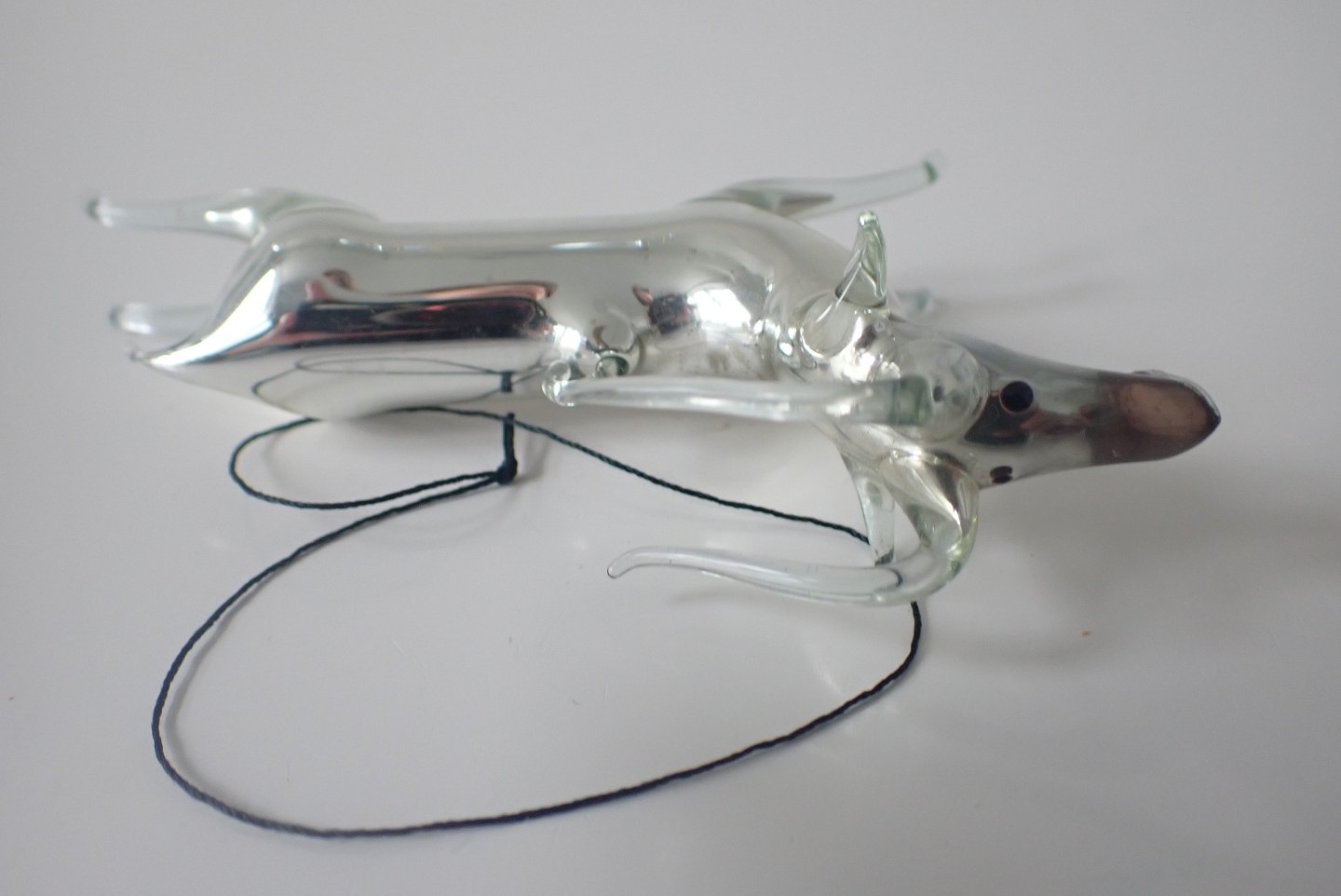 Glasjulepynt - sjælden glashjort, sølvfarvet. Med glasophæng. Leipzig tidlig 1900-tal. Højde. 5,2 cm. Længde: 9 cm. Hel og fin stand uden afslag. Udstiller