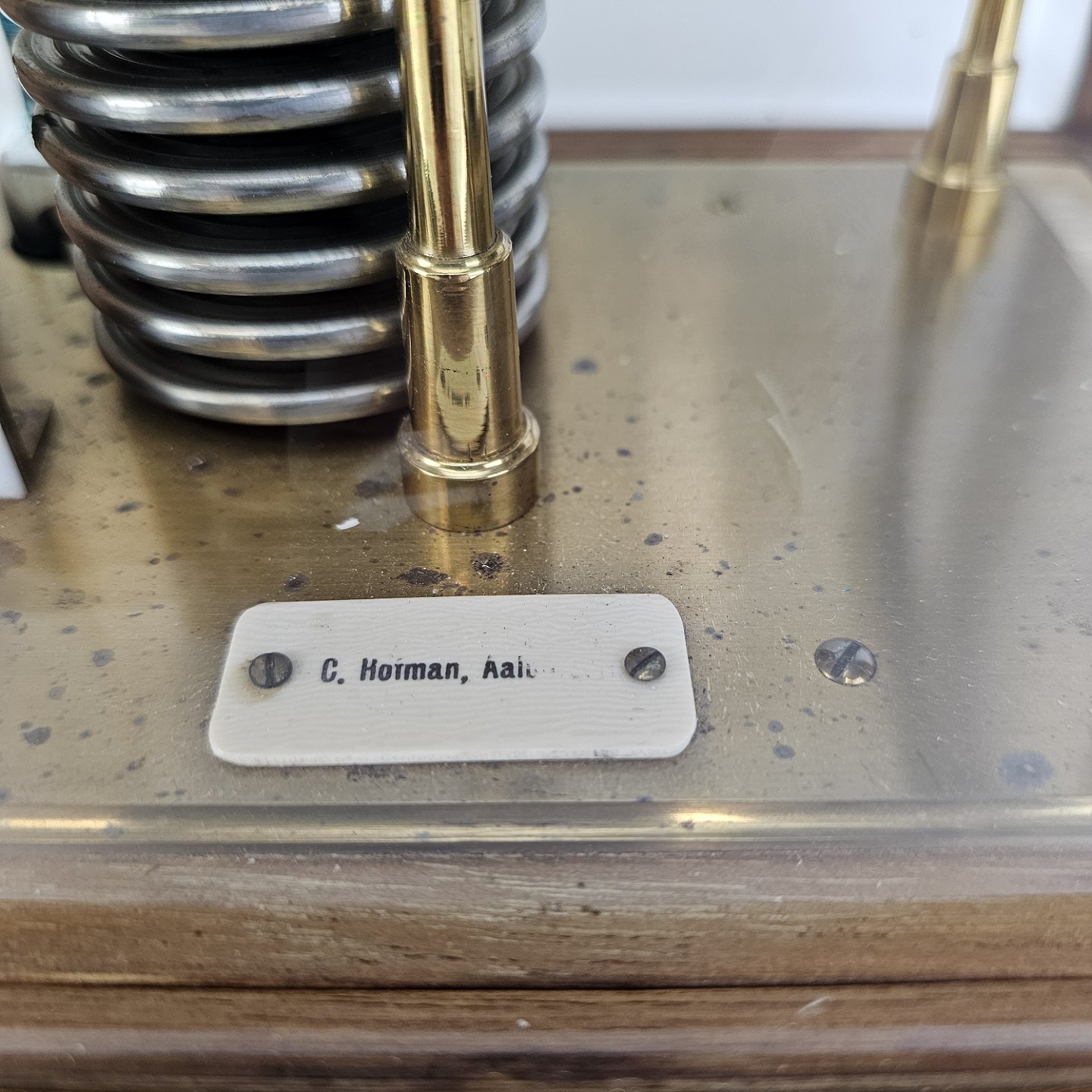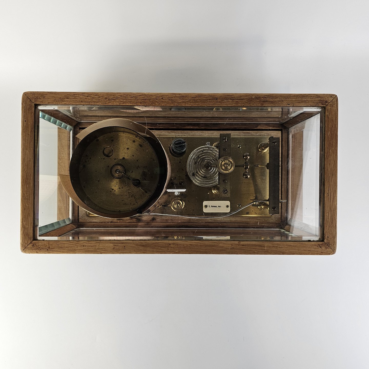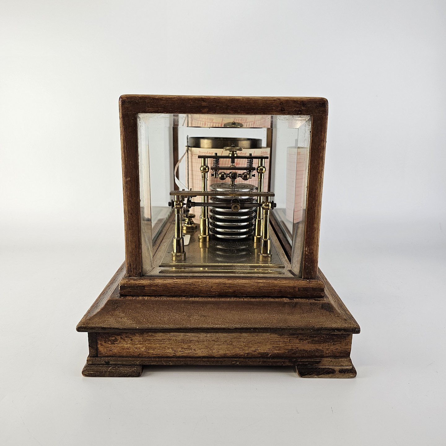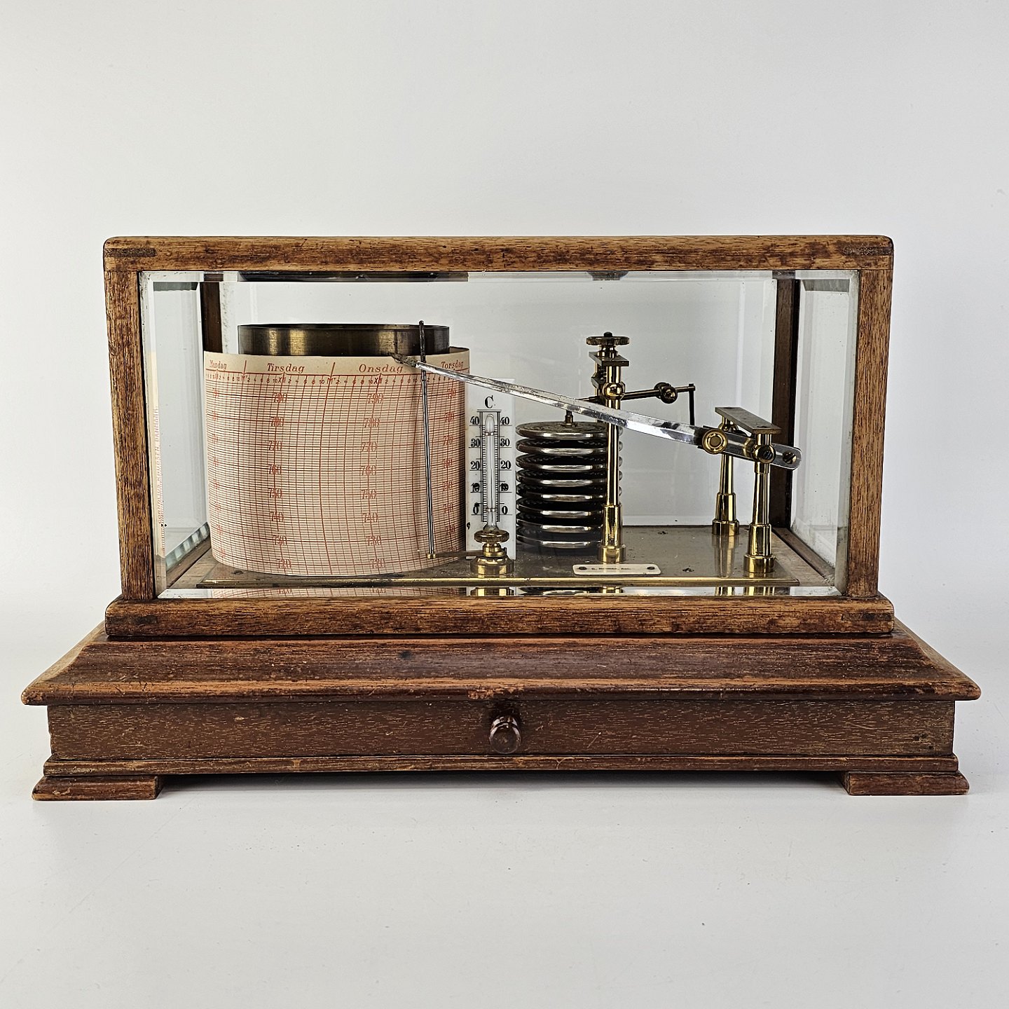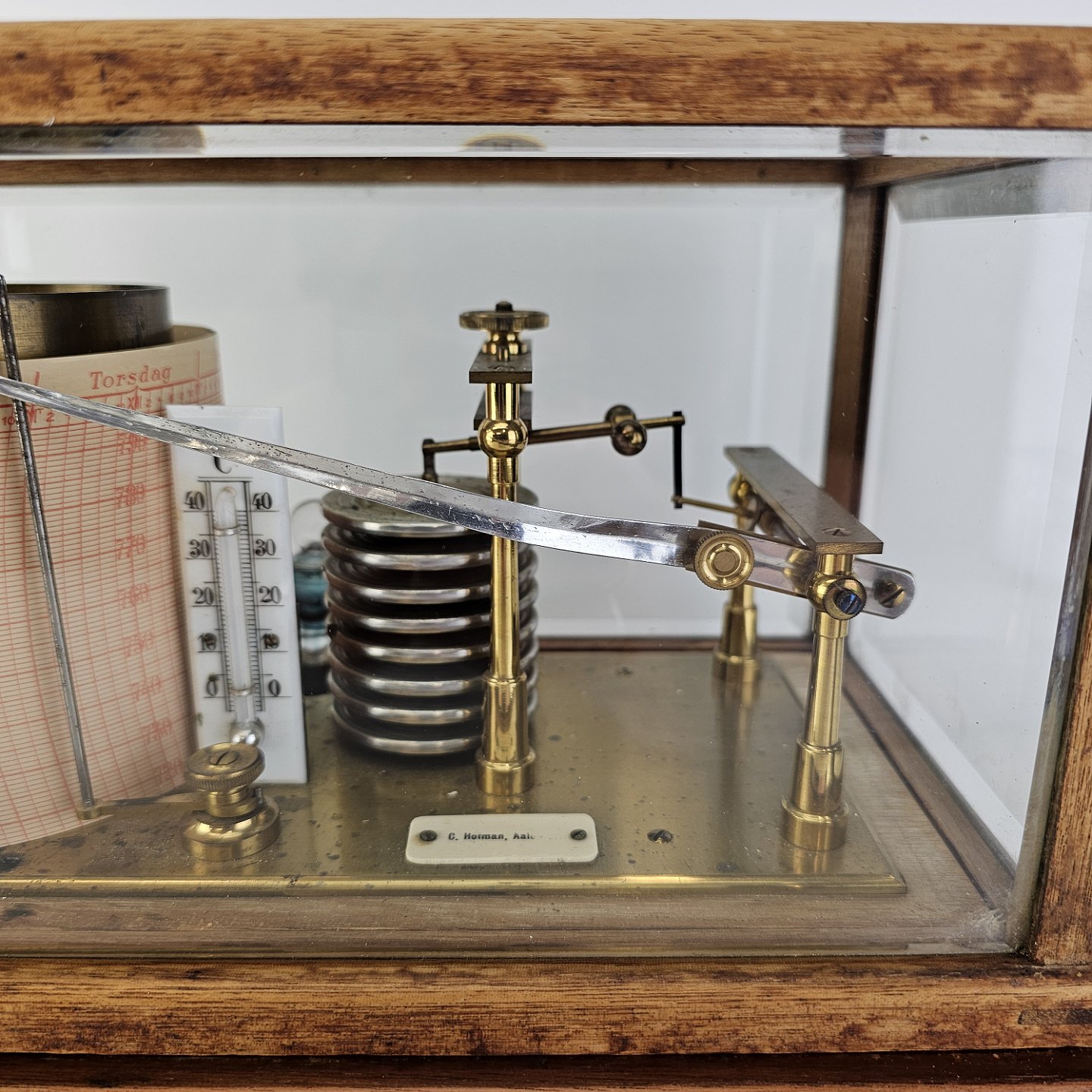 Barograf i kasse af træ og glas, med en skuffe i bundenMærkat med C. Horman, Aalborg, delvist skrabet af