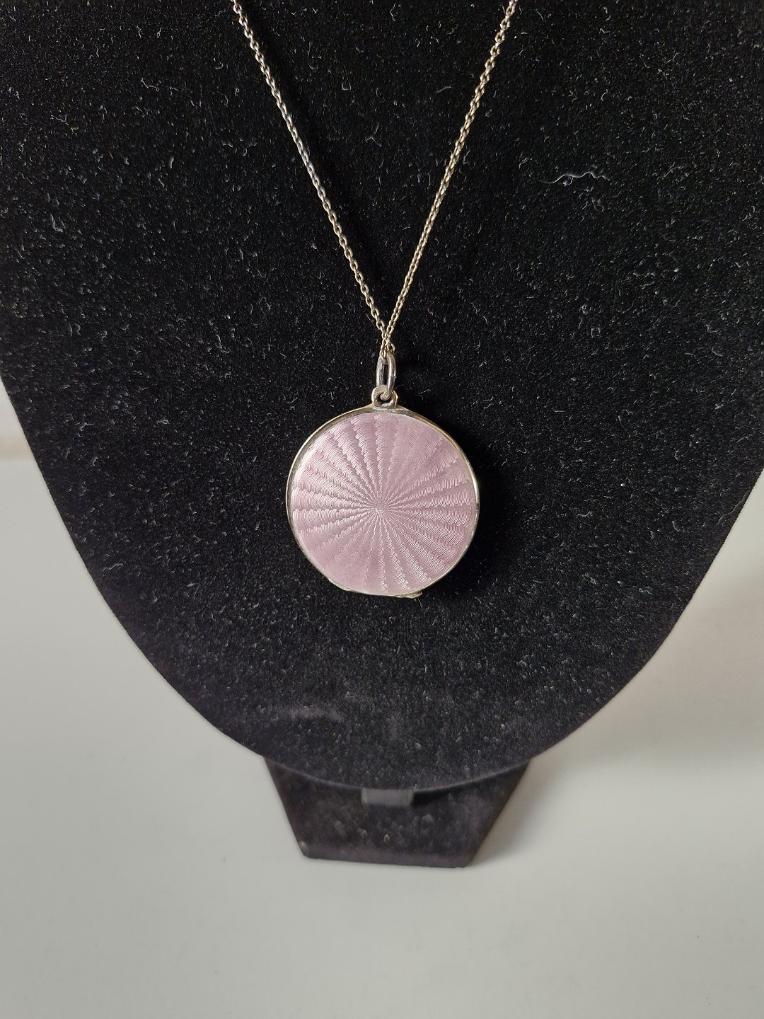 Smuk svensk medaljon med kæde i forgyldt sølv og lyslilla/lyserød emalje dekoreret med kirsebærblomsterStemplet: De tre kroner - S - 830