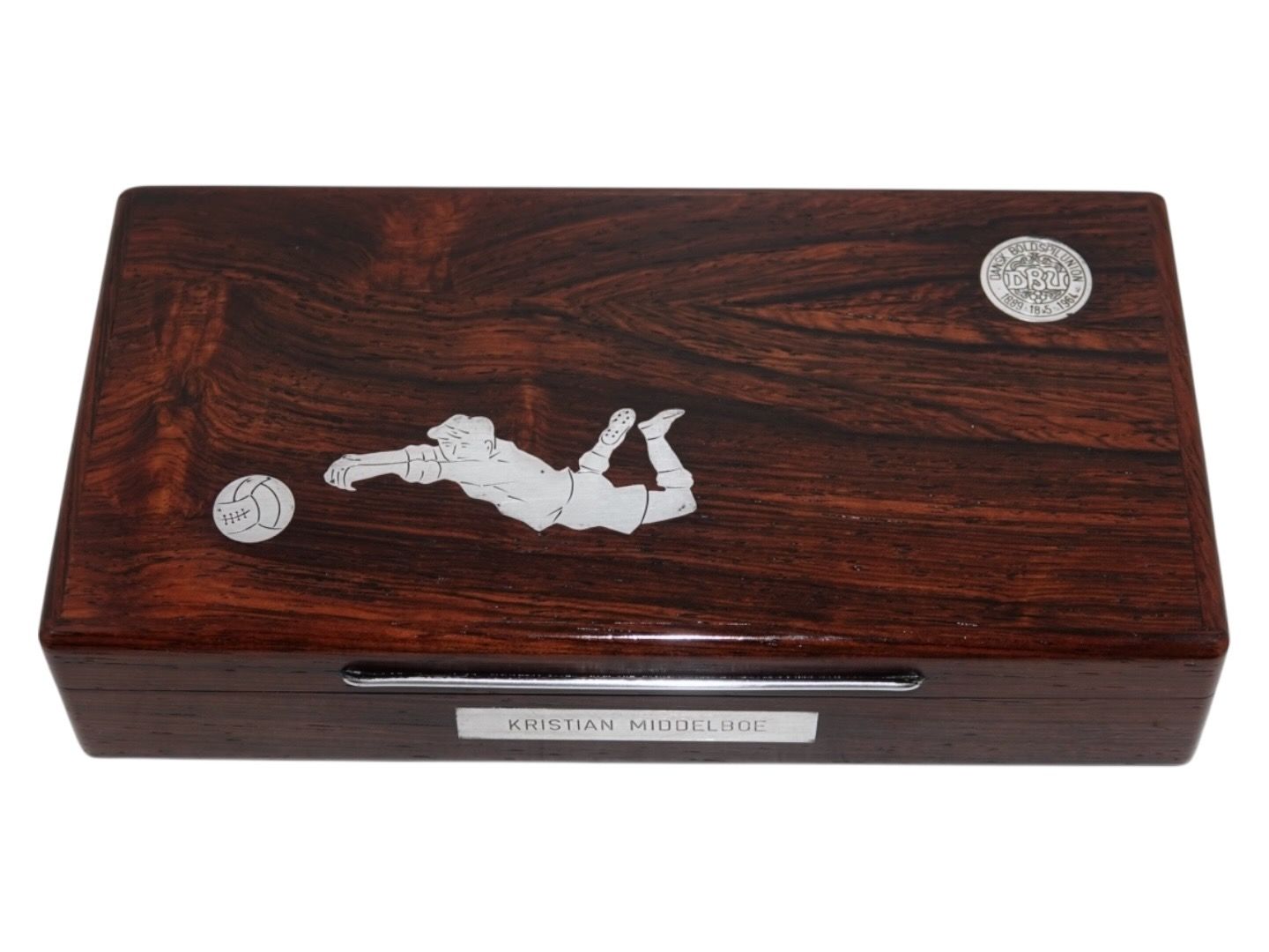 DBU (Dansk Boldspil Union) memorabilia. Palisander æske med indlagt sølv af fodboldspiller og etikette. Æsken er givet til Kristian Middelboe som både var fodboldspiller på landsholdet og senere formand for DBU. Der medfølger en lille udklippet avisartikel. Æsken er fra 1964.Måler 19,2 x 9,8 cm.