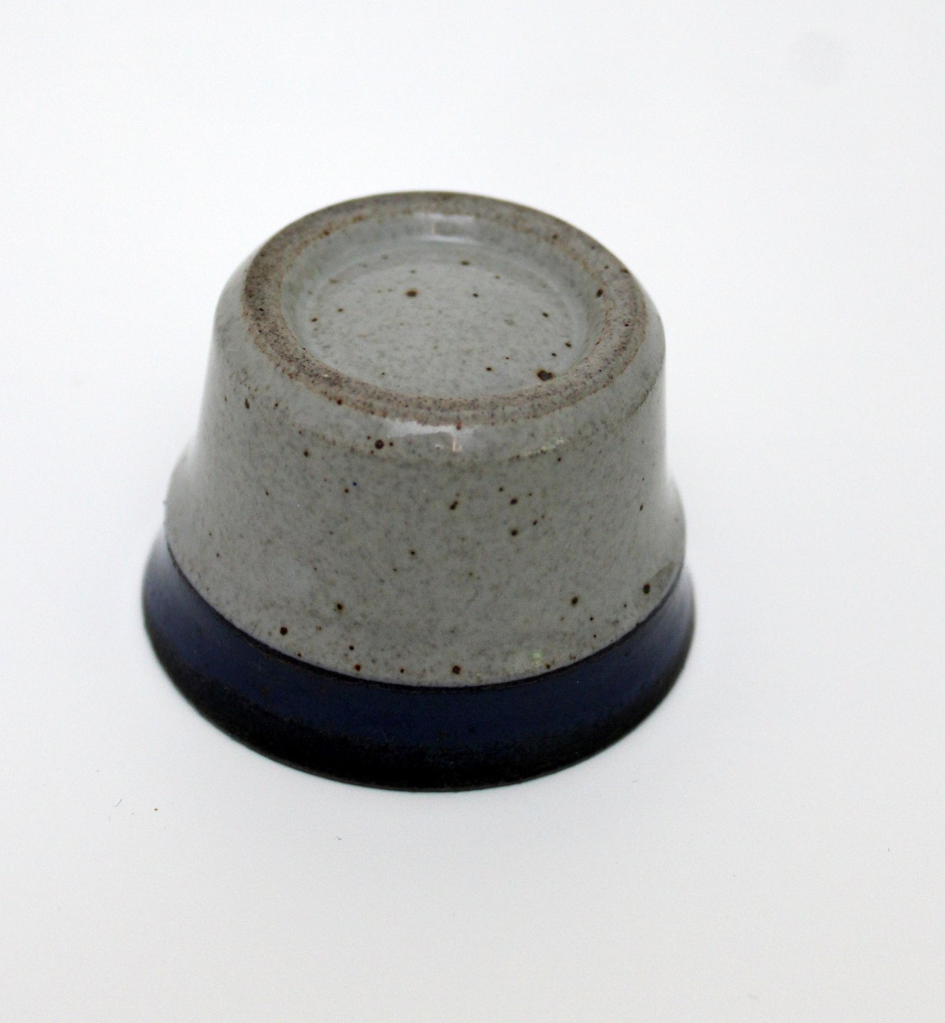 Knabstrup, Christine stentøjsstel grå glasur med blå kant. Designet af den tyske kunstner Christine Konschak, som var tilknyttet Knabstrup i perioden 1967-1970.Æggebæger. Højde 4 cm. Diameter 6 cm. Pris: 60 kr. stk. Lager: 3