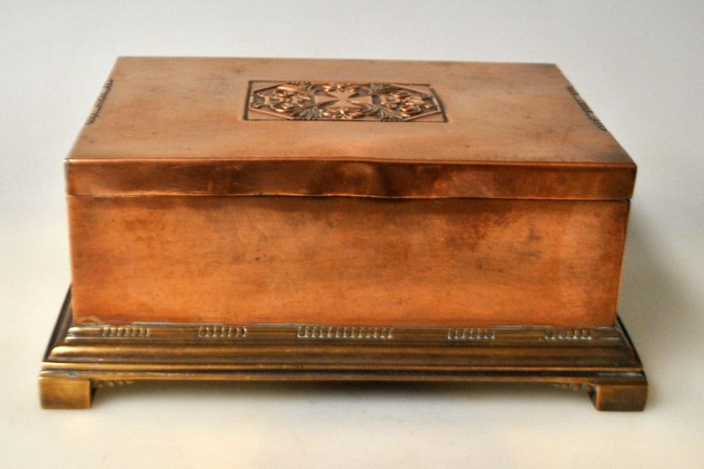 DFDS cigarskrin af kobber og messing, indvendig med træ. 1916. Johan Rohde for Georg Jensen. Præget med skønvirkemotiver og DFDS 1866-1916. Indvendig plakette: Til Minde Om Det Forenede Dampskibsselskabs 50 Aarige Stiftelsesdag. H. 8,5 B. 19 D. 14. cm.Fremstår med brugsspor i form af enkelte tryk og ridser.<br />Skrinet blev fremstillet i kobber, sølv og ét eksemplar i guld til kong Christian X.