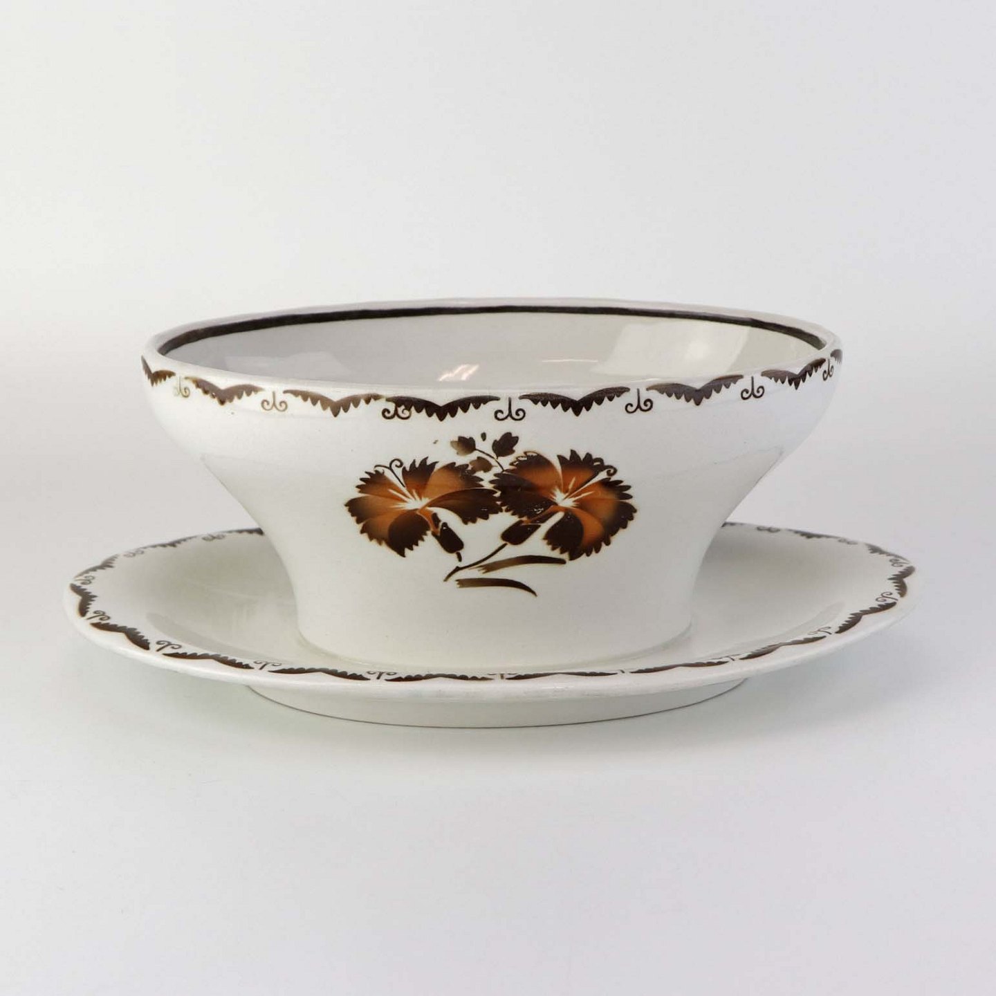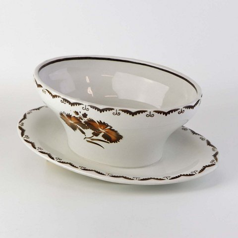 Stel i glat hvid fajance i stelform C med dekoration af brune nelliker og ranker. Stellet blev produceret i perioden år 1930-1941