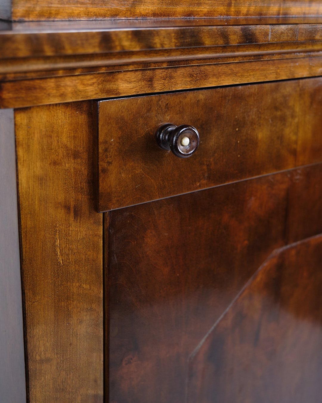 antik sekretær fra 1840’erne, udført i håndpoleret birketræ med smukke intarsia-detaljer. Møblet er indrettet med to skuffer og fremstår som et fint eksempel på 1800-tallets klassiske snedkerhåndværk, hvor funktionalitet og dekorativt udtryk blev forenet.— Oprindelse: Danmark