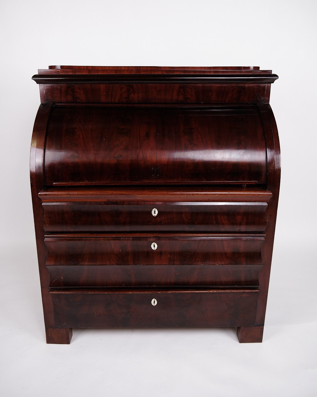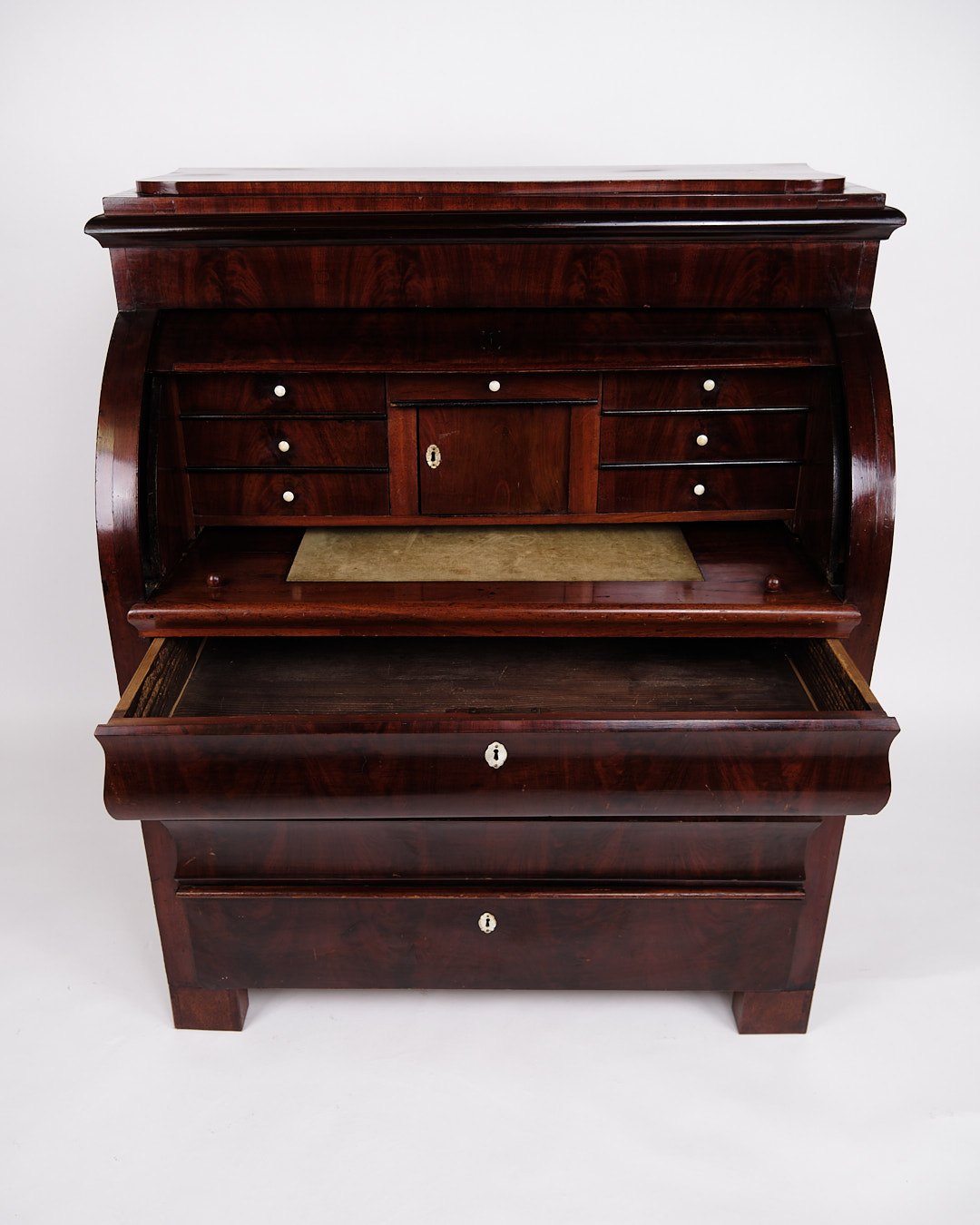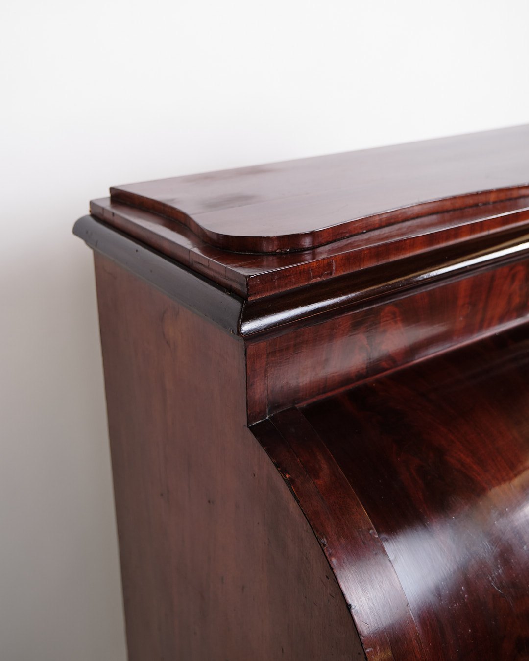 — Materiale: Håndpoleret mahogni med perlemorsbeslag og benknopper