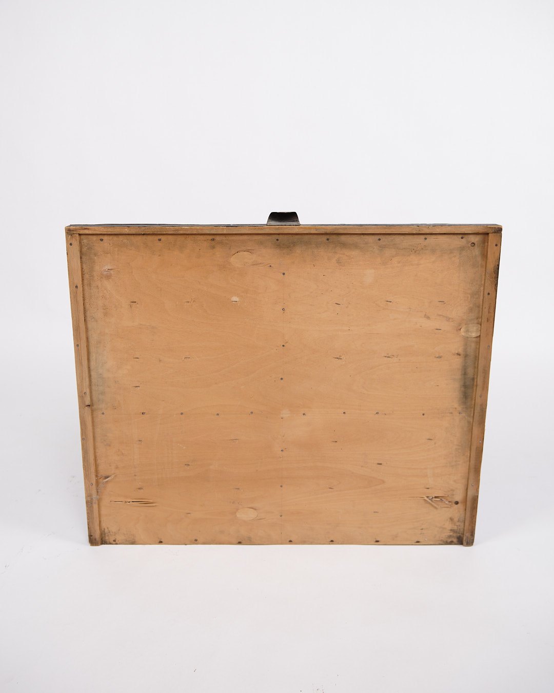 Gammel væghængt sættekasse fra 1930’erne. Sort bemalet træ med små rum.