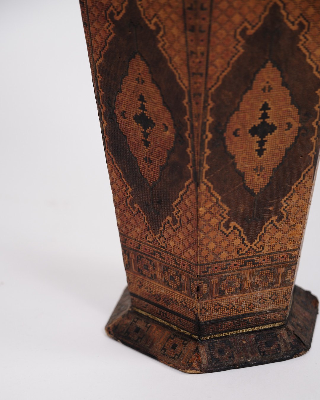 Dekorativ vase fra 1900-tallet, udført i mørkt træ med smukt orientalsk inspireret intarsia.— Periode: 1900-tallet