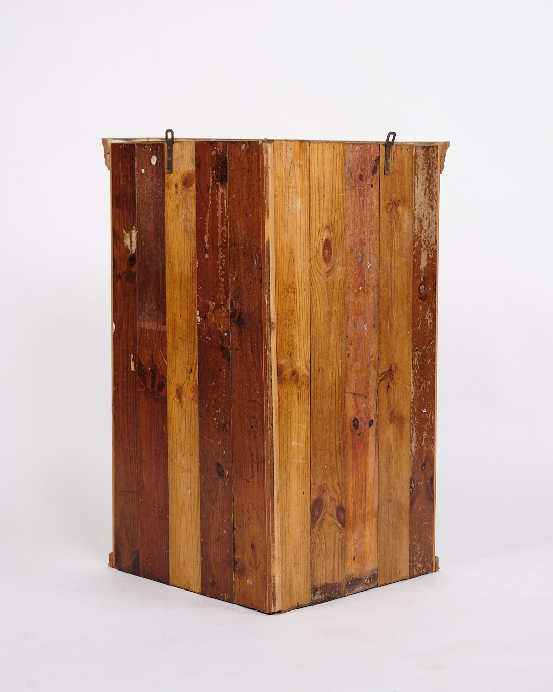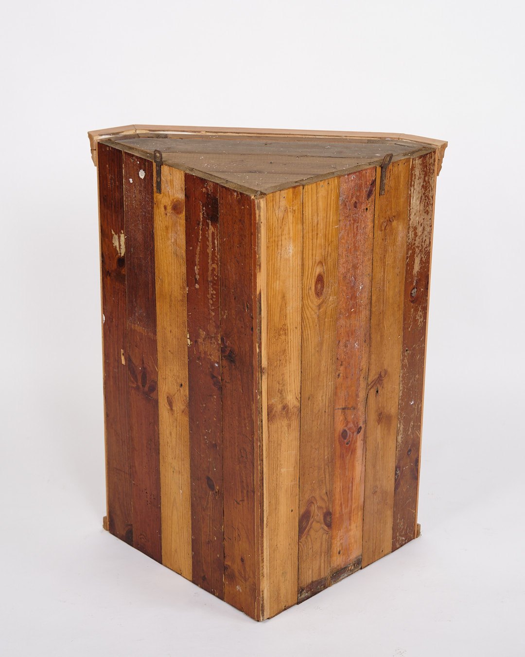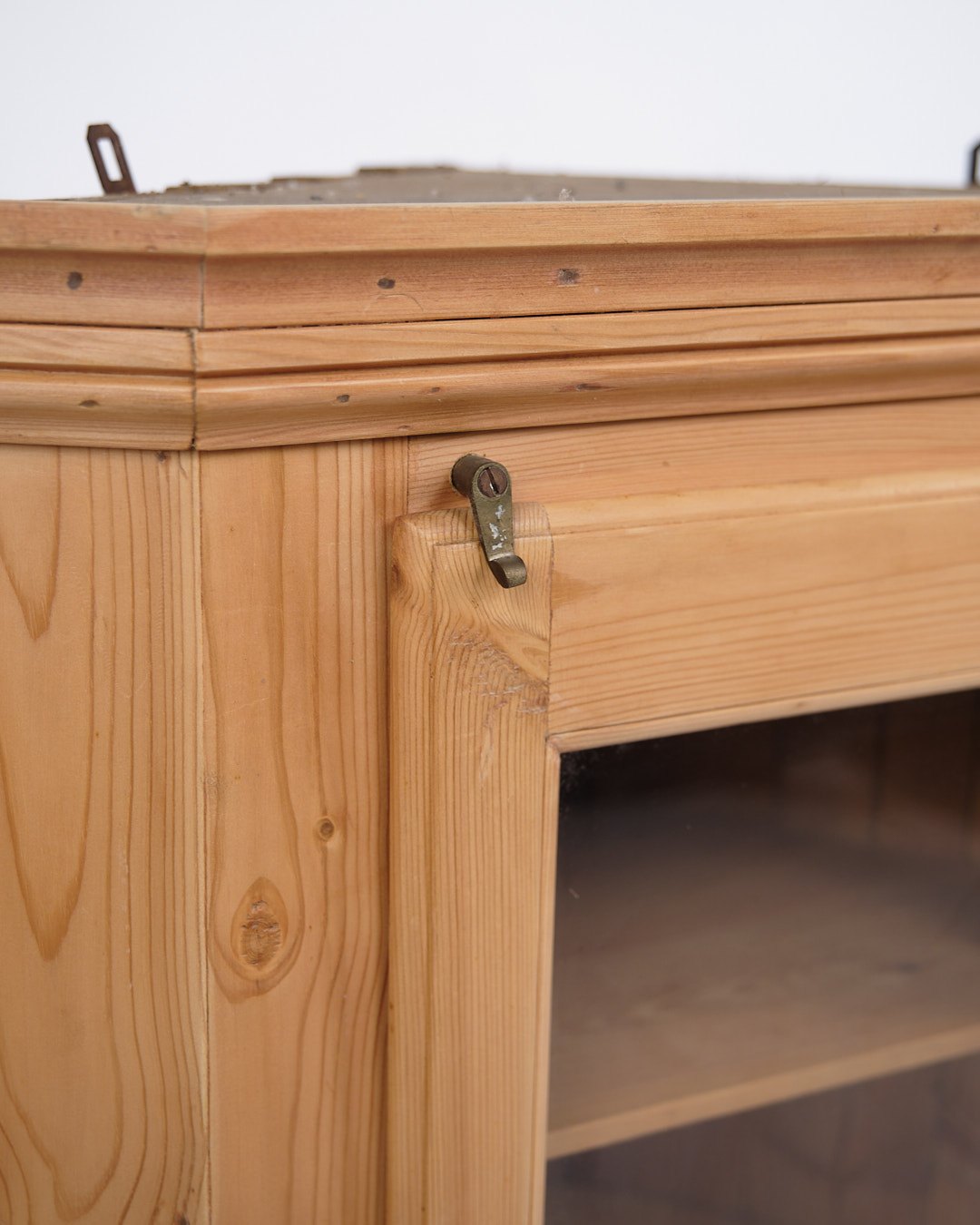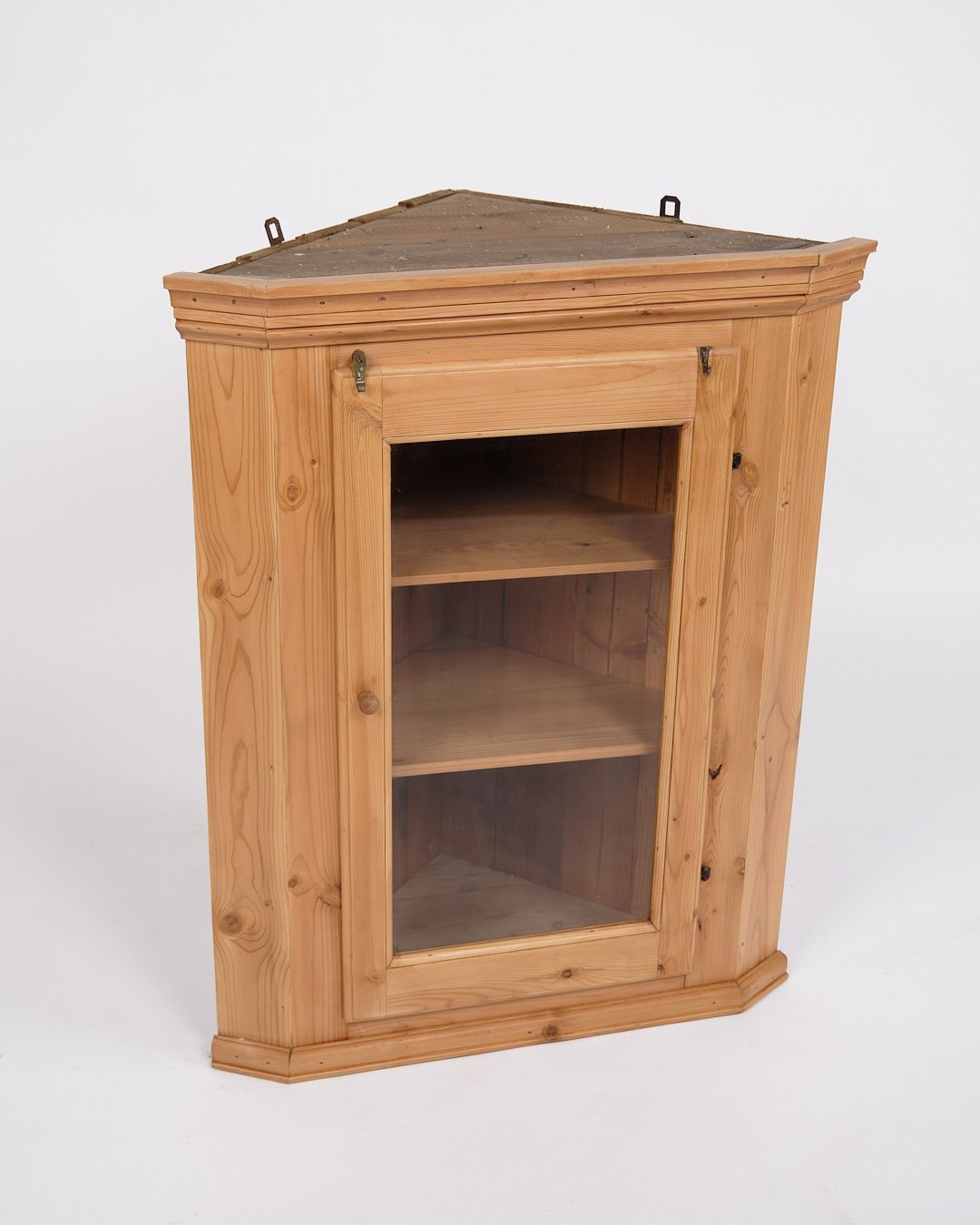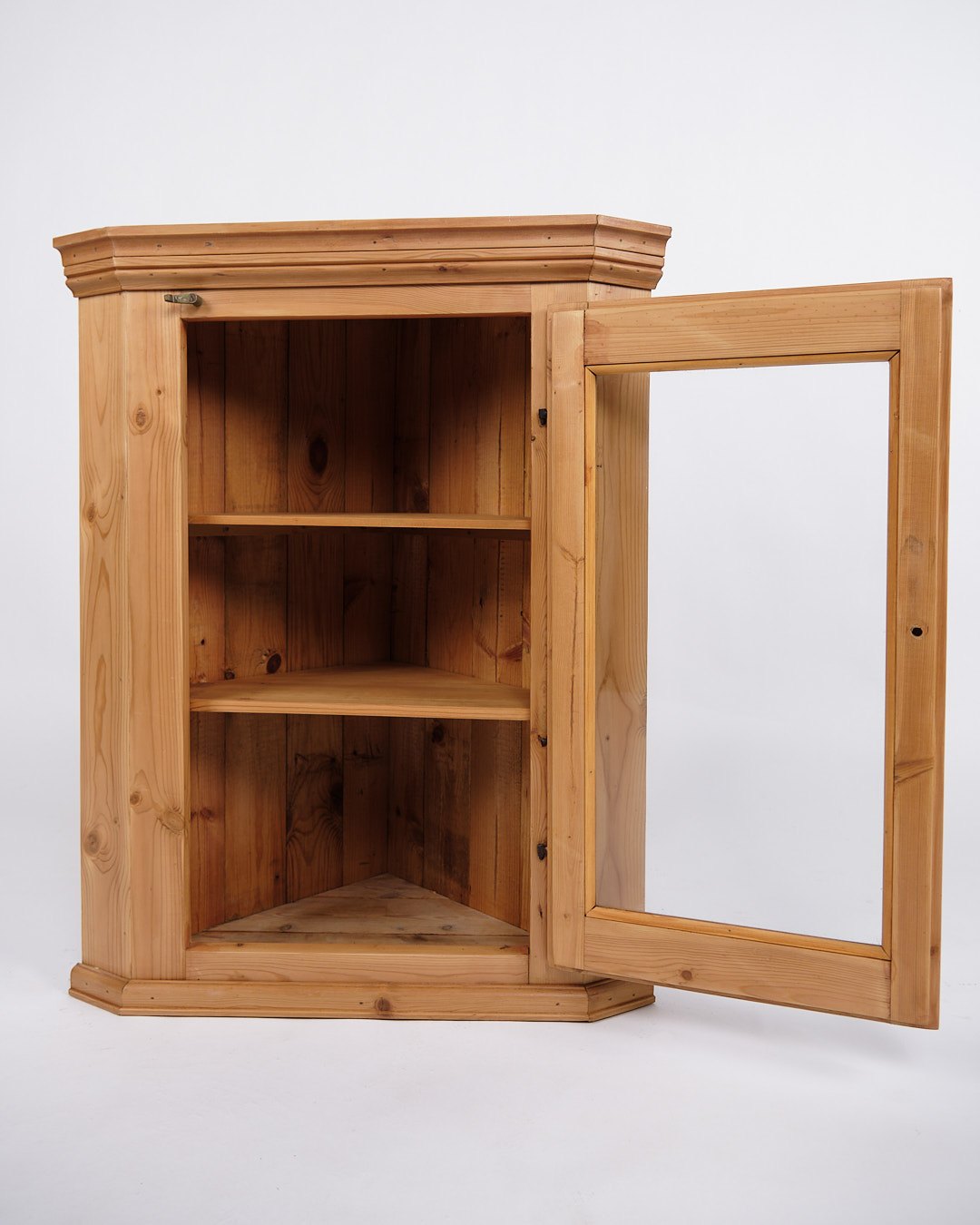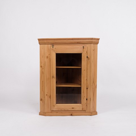 Antikt hænge hjørneskab i fyrretræ med glasdør. Fra 1890’erne.