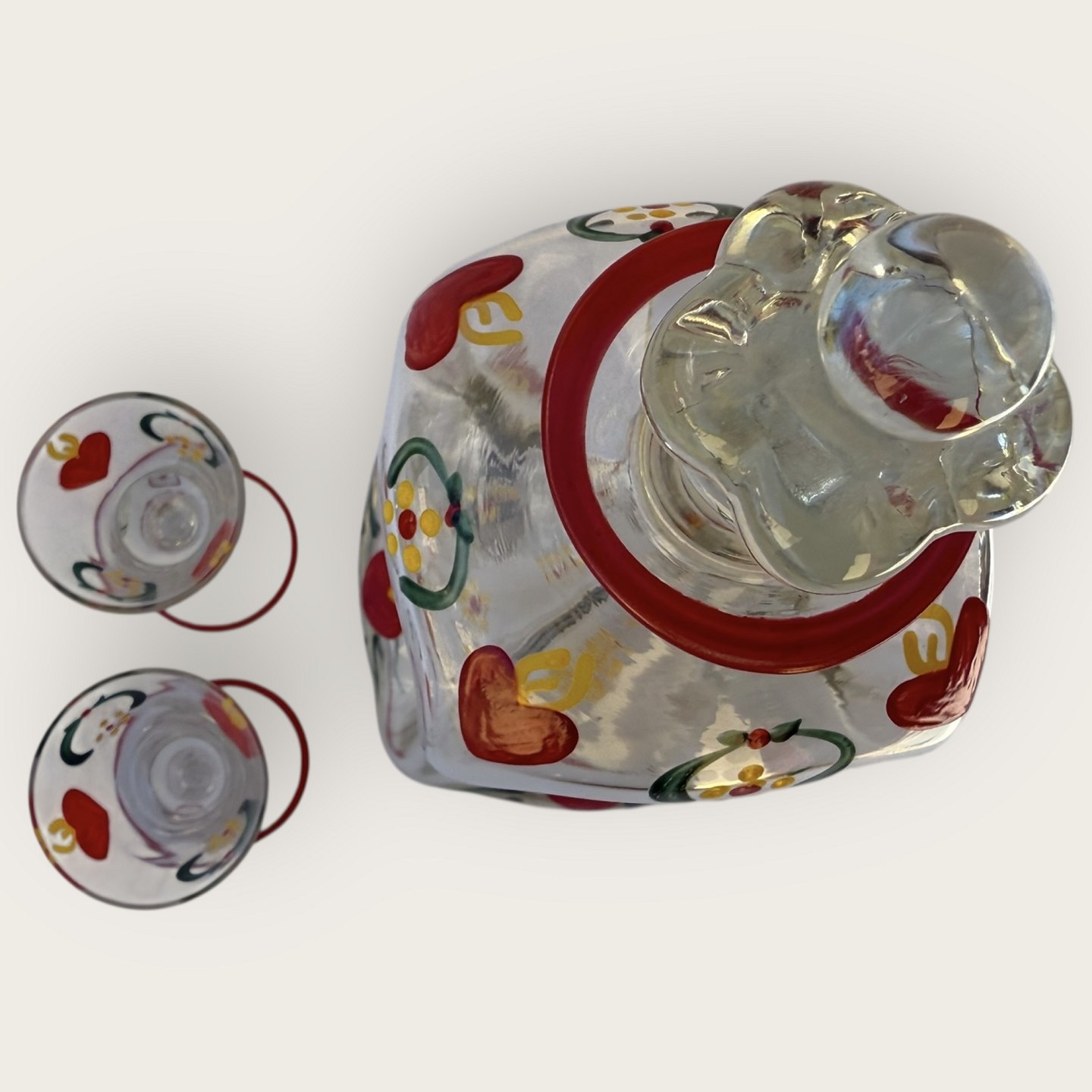 Holmegaard, Bemalet klukflaske med kroneprop og 2 glas, udsmykket med røde hjerter m.v.; Højde 25cm, højde snapseglas 10cmLager: 1