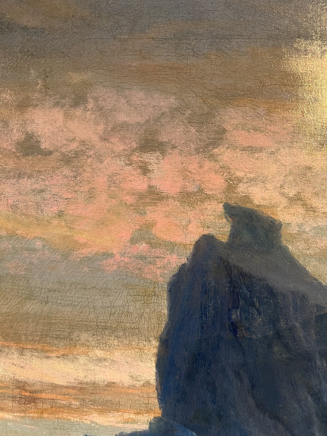 I E C Rasmussen parti fra Grønland med skib, isbjerge og solnedgangJens Erik Carl Rasmussen, 1841-93, olie på lærred
