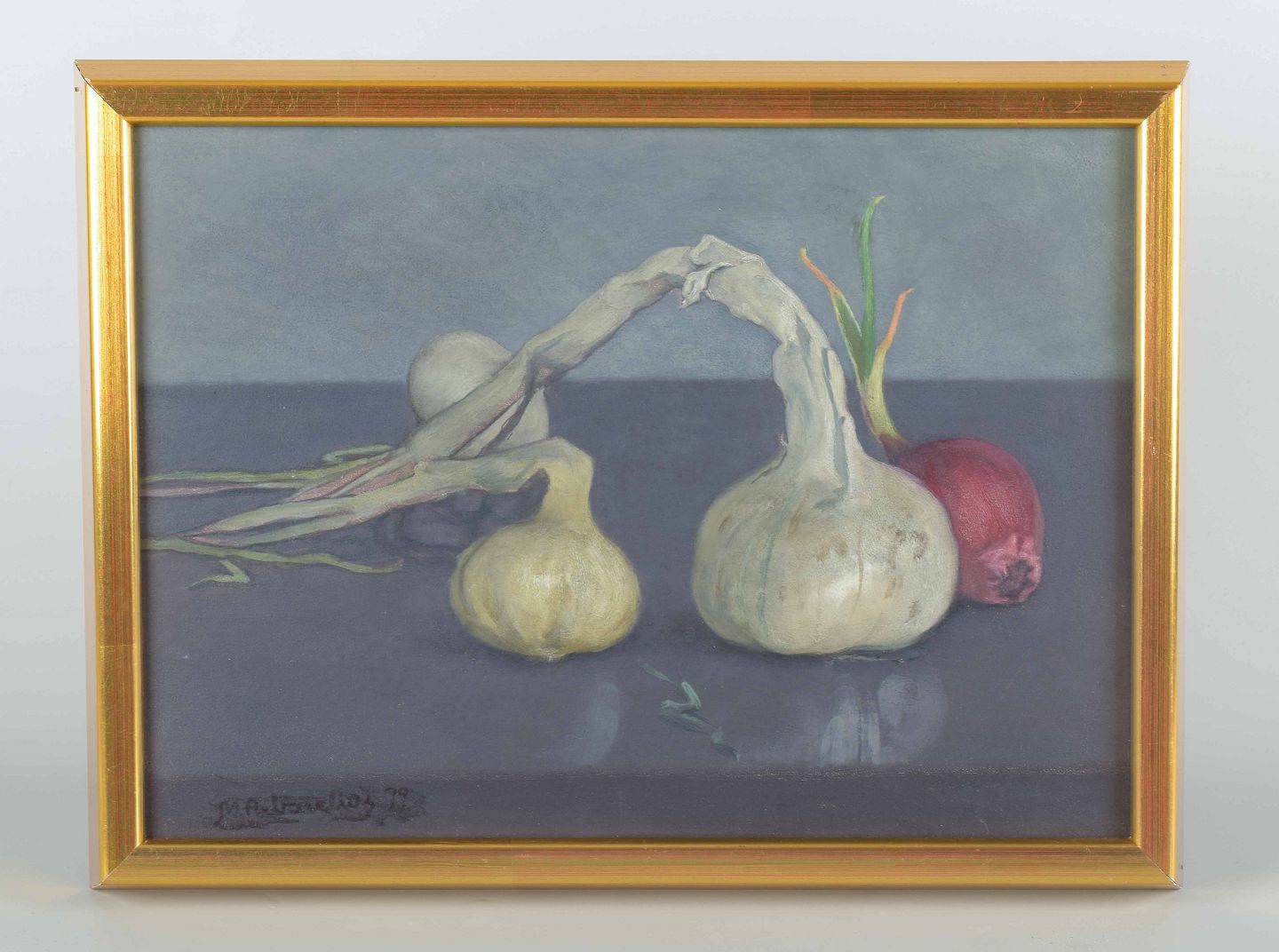 Et stilleben med løg og hvidløg gengivet i afdæmpede grå, grønne og rødlige nuancer. Kompositionen er enkel og præcis, med en realistisk gengivelse af de organiske former og en rolig, næsten meditativ atmosfære. Værket vidner om kunstnerens sans for detalje og den klassiske maleriske disciplin i naturalismen.