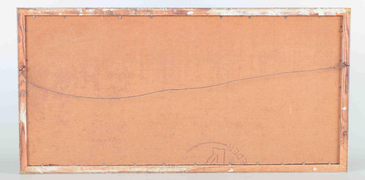 Et ekspressivt landskabsmaleri udført i en farverig og forenklet stil, hvor blå og lilla toner dominerer forgrunden, mens grønne og gule flader antyder marker og bevoksning. Maleriet bærer præg af en kraftfuld penselføring og en næsten abstrakt opbygning, hvor naturens former opløses i rytmiske farvefelter.