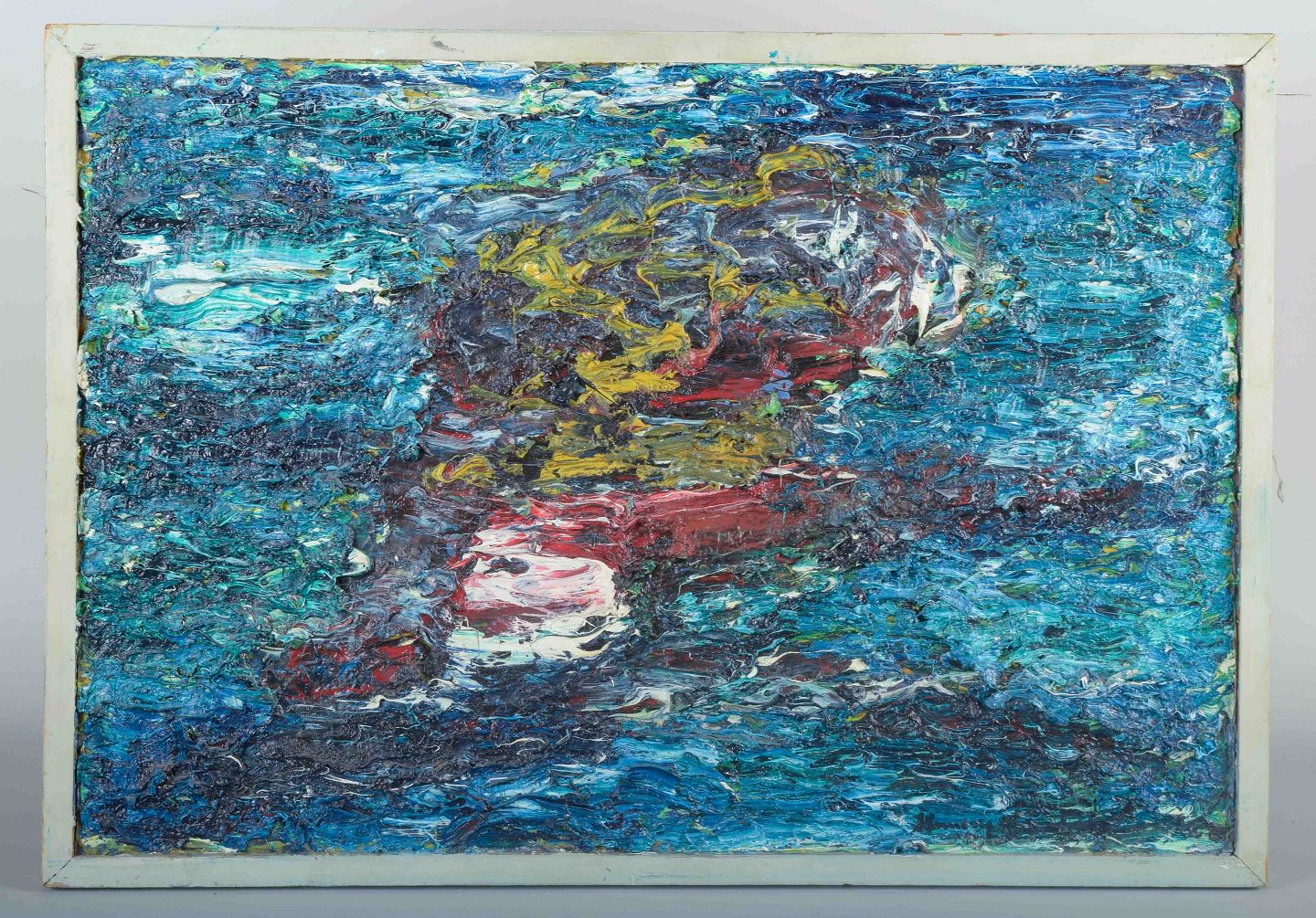 Et ekspressivt, koloristisk maleri udført med kraftige, pastose strøg i blå, røde, gule og hvide nuancer. Værket fremstår som en struktureret, men fri abstrakt flade, hvor farverne danner en dynamisk og levende komposition.