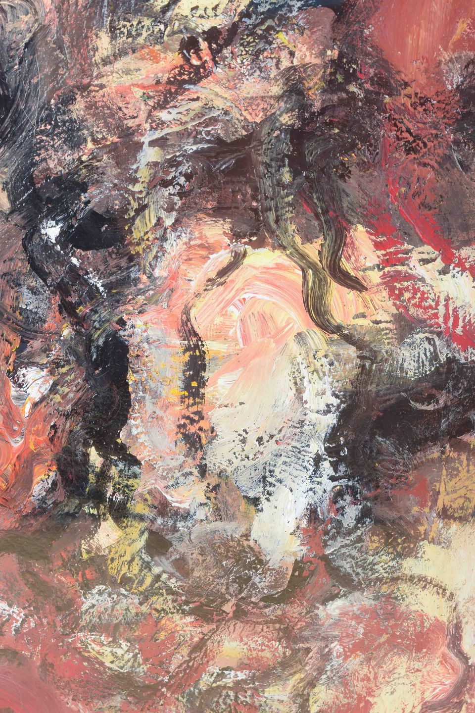 Et ekspressivt maleri af Erik Bille Christiansen udført i 1993. Kompositionen er præget af kraftige penselstrøg og et varmt farvespil i røde, sorte og jordfarvede nuancer, hvor figurative elementer antydes i en ellers abstrakt billedverden.