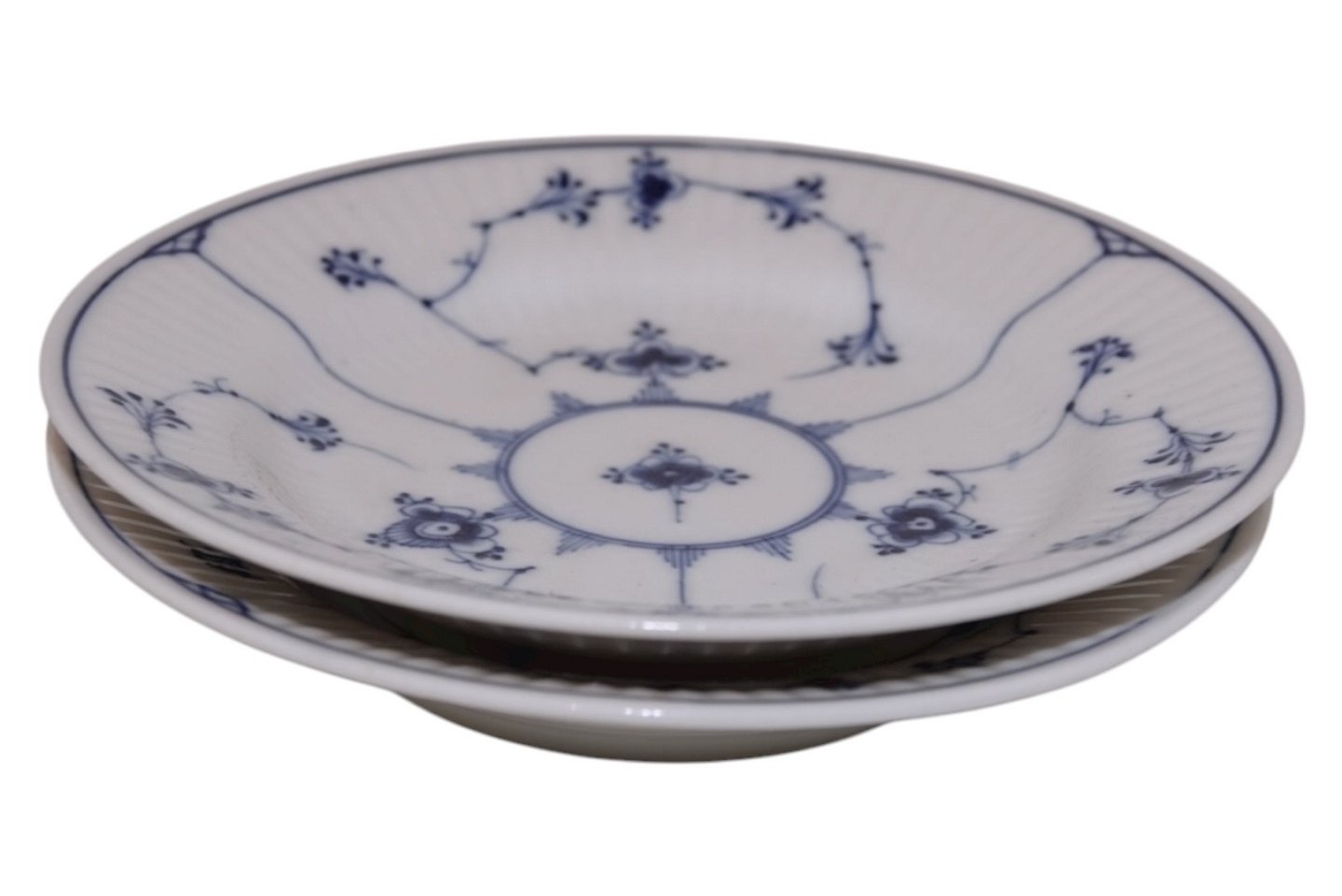 Bing & Grøndahl Blåmalet Riflet (Musselmalet Riflet), lille brødtallerken.Af fabriksmærket ses det, at disse er produceret mellem 1895 og 1898.