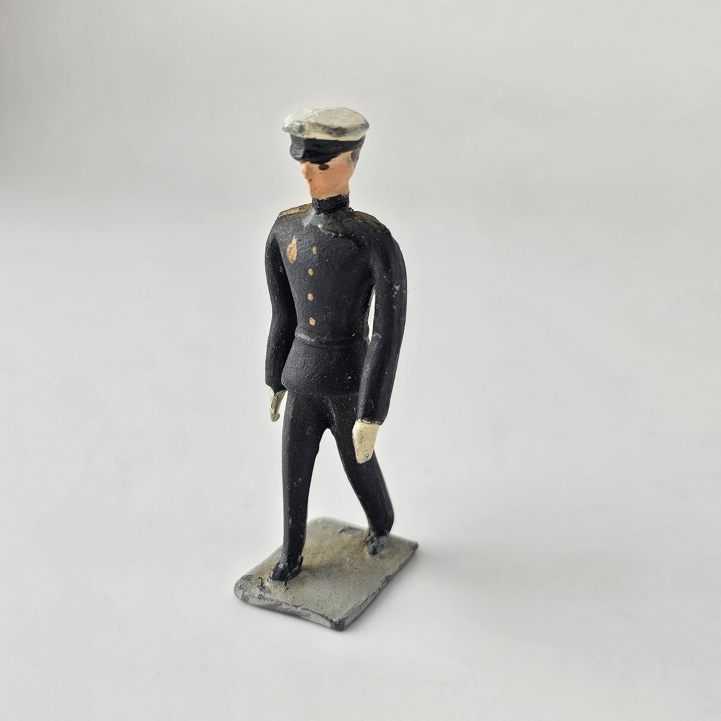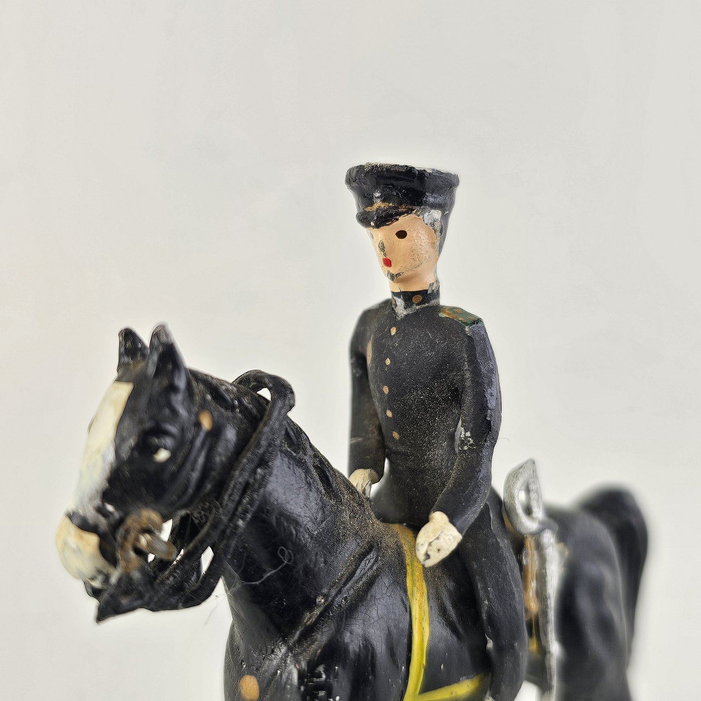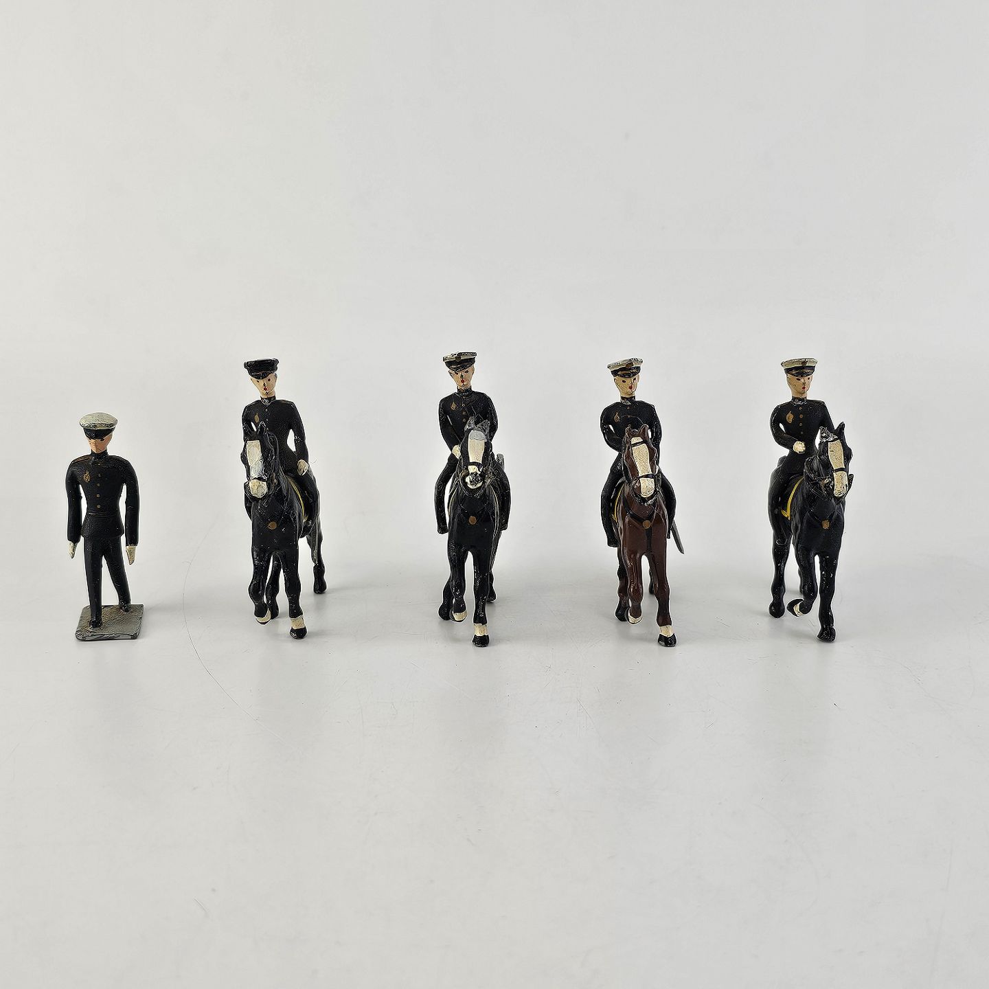 Fem figurer af politifolk i tin, én stående og fire til hestStående figur