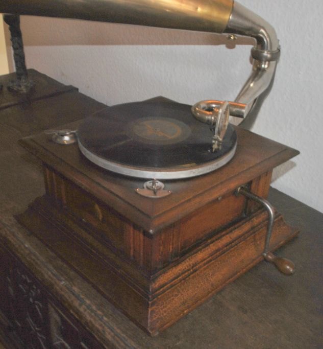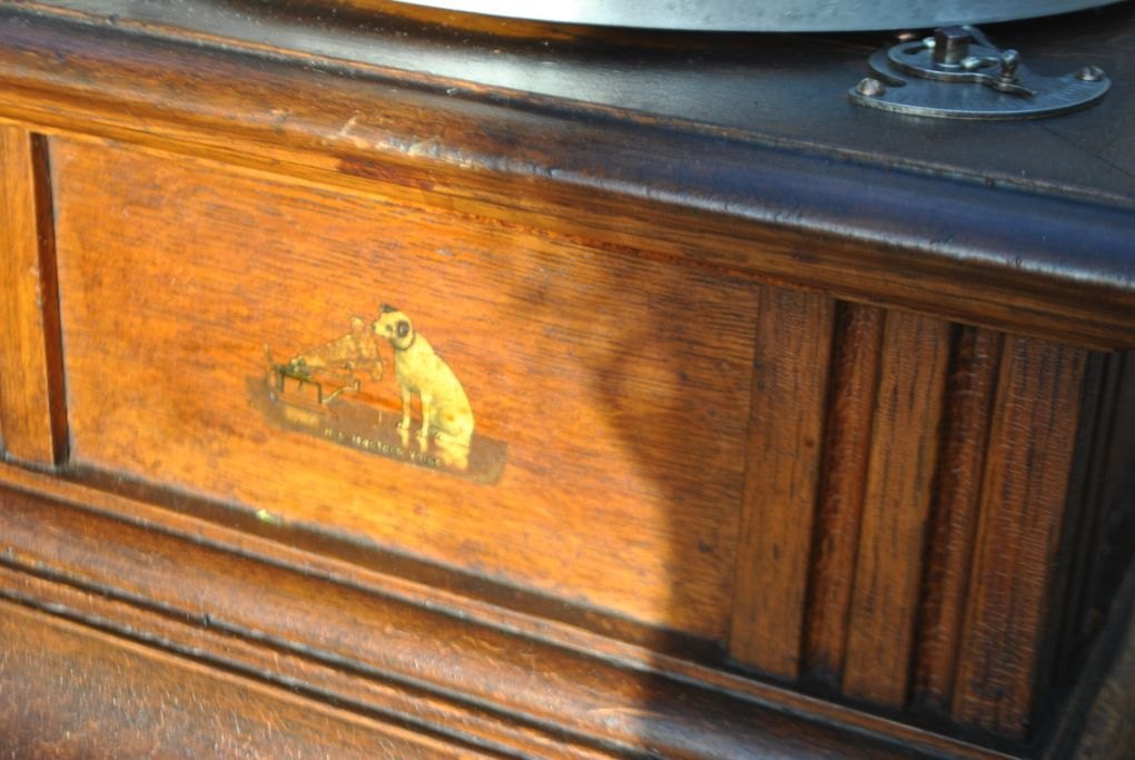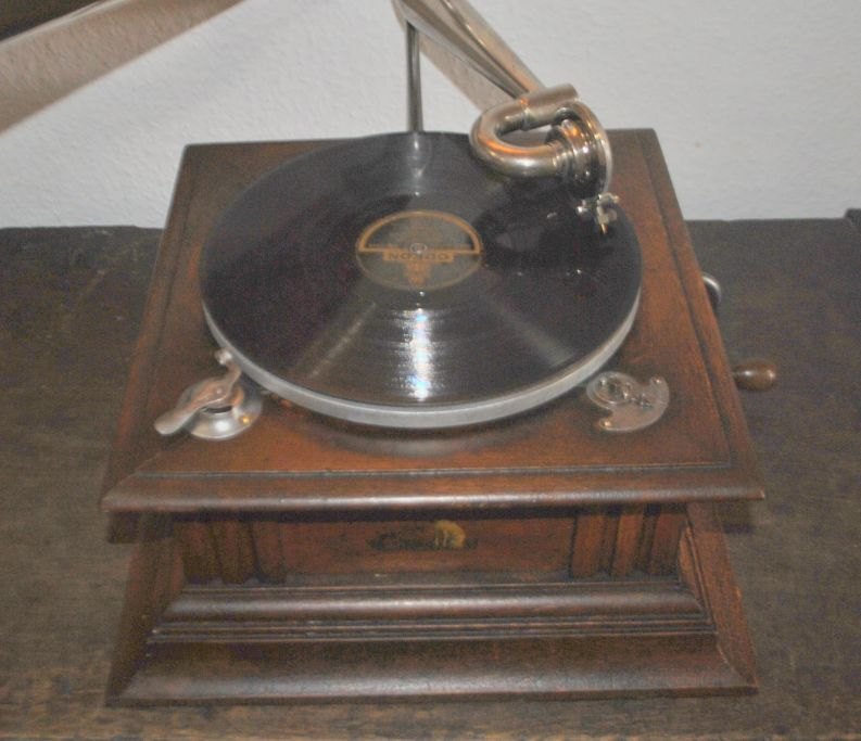 Original tragtgrammofon. ca. 1900. Maestrophone, Maestoso, His masters Voice. Til afspilning af 78' plader. Produceret i Schweiz. 37 x 37 cm. Tragt: L. 70 cm. Dia.: 42,5 cm.Flot stand! Kan spille!