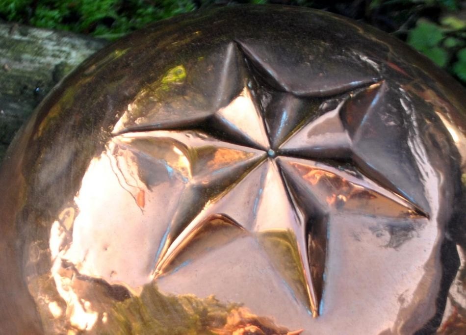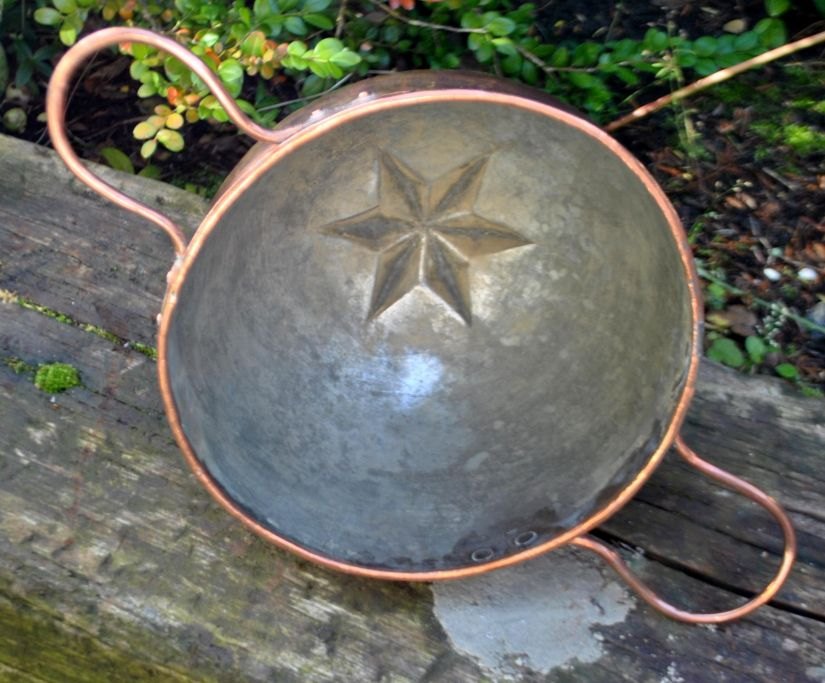 Postej eller kødform, kobber, 19. årh. Danmark. Med to hanke og dekoration i form af stjerne. Dia: 21,5 cm. Dia. inkl. hanke: 37,5 cm. H: 14 cm. Ingen synlige stempler.Emne nummer: 28306