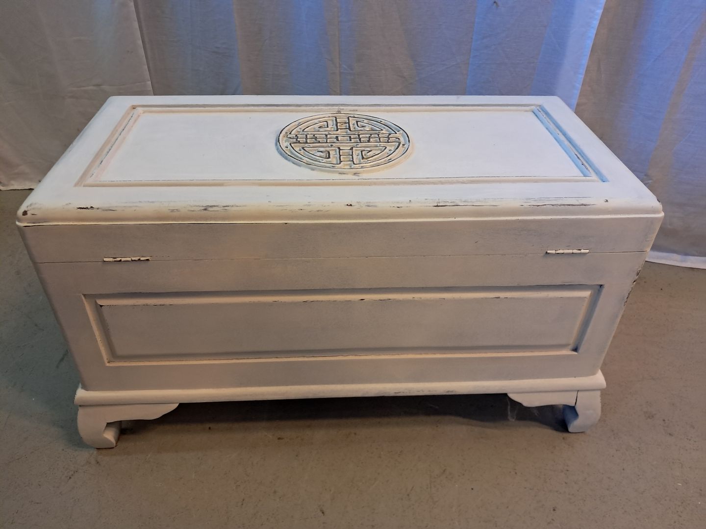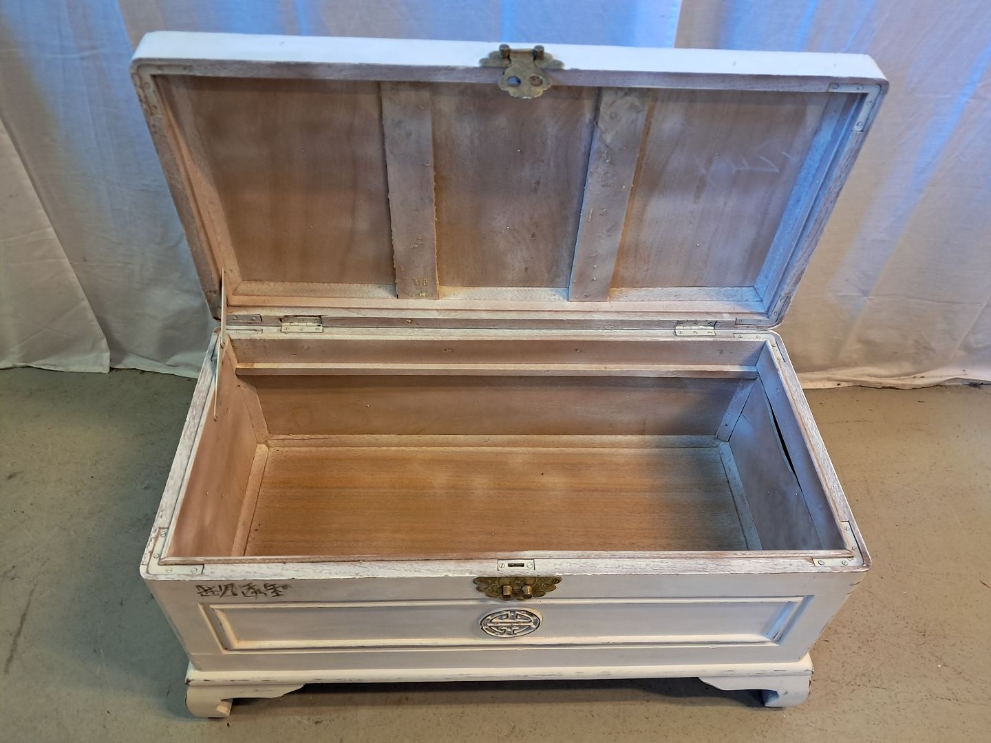 Malet kiste i kamfertræ, fra 1970erne.Den har brugsspor.