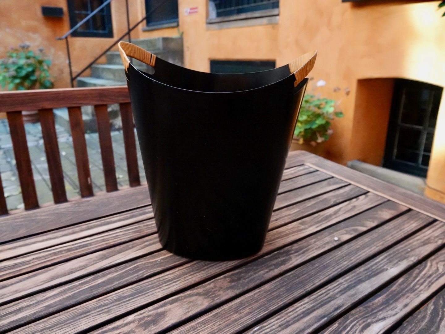 Papirkurv i sort metal med basthanke.Designet af Finn Juhl og Grethe Kornerup-Bang i 1950'erne og produceret hos Torben Ørskov.