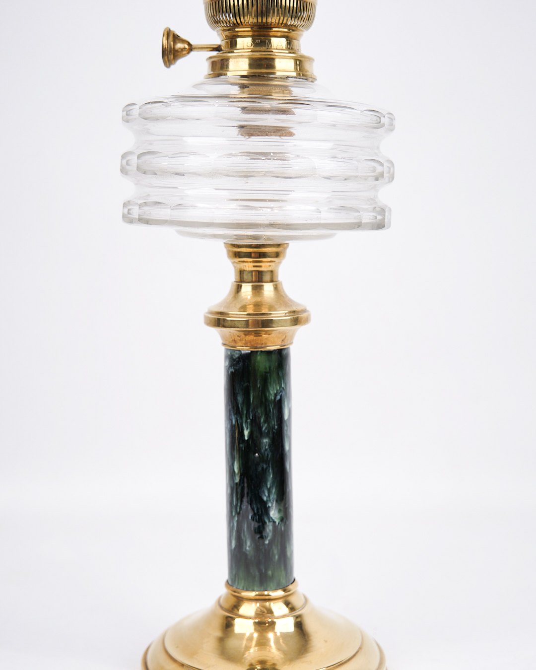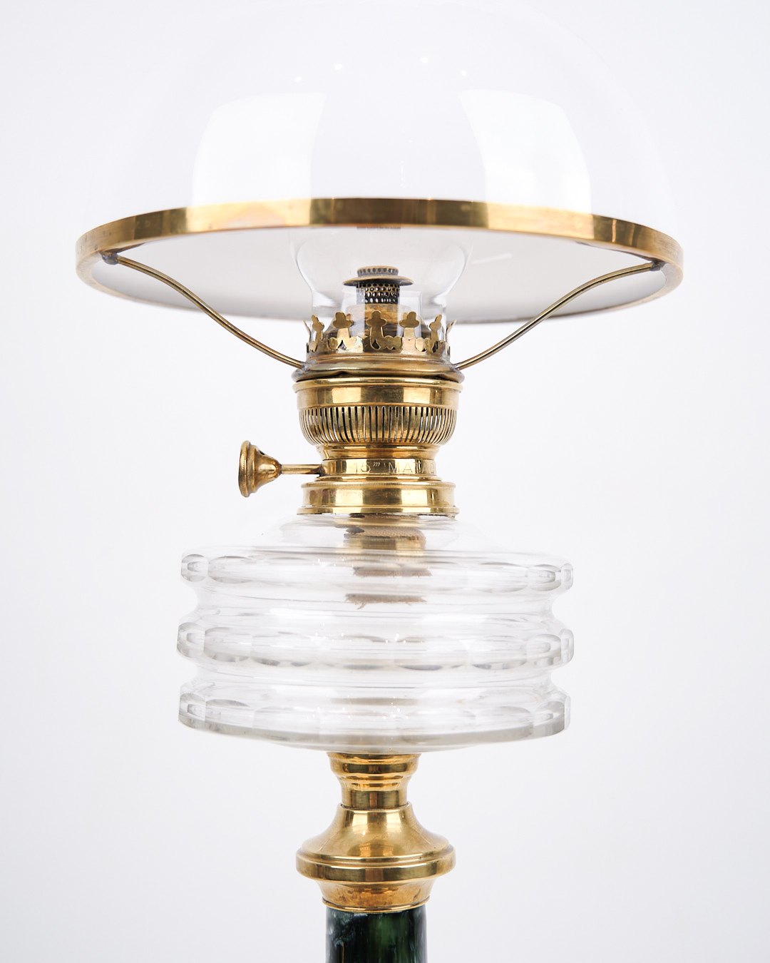Antik petroleumslampe fra 1880’erne, fremstillet af Fynsk Glasværk. Lampen er udført i messing med marmoreret fod og hvid kuppel i opalglas, som giver et blødt og stemningsfuldt lys.