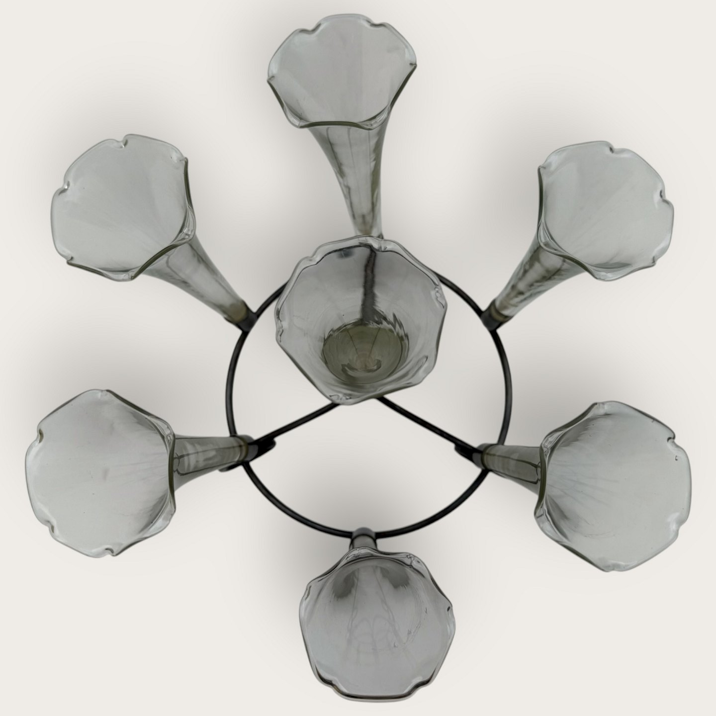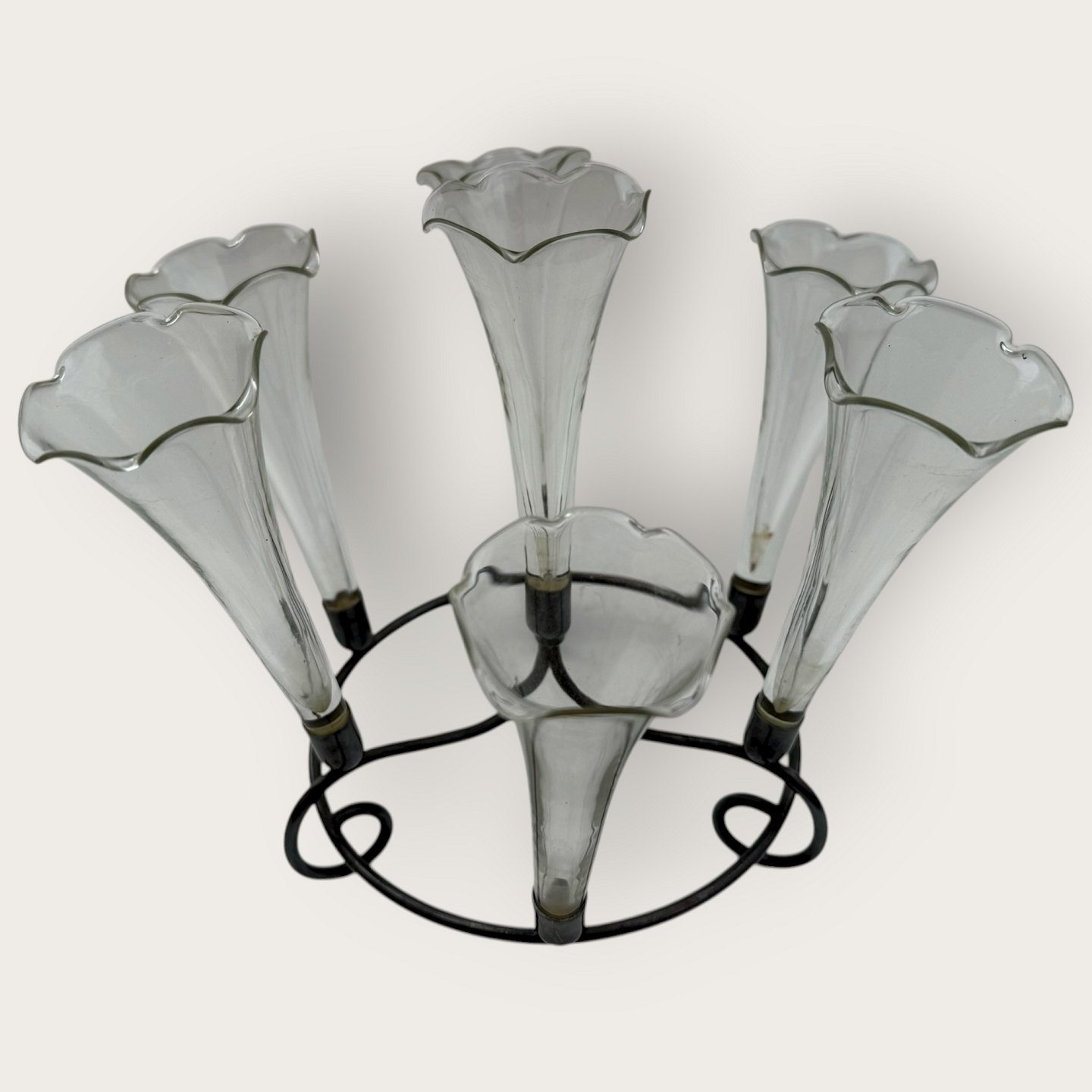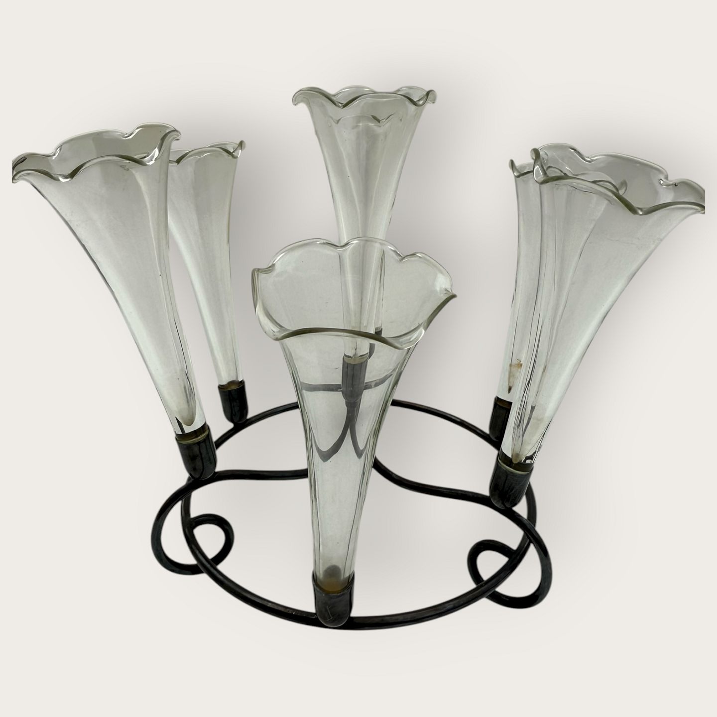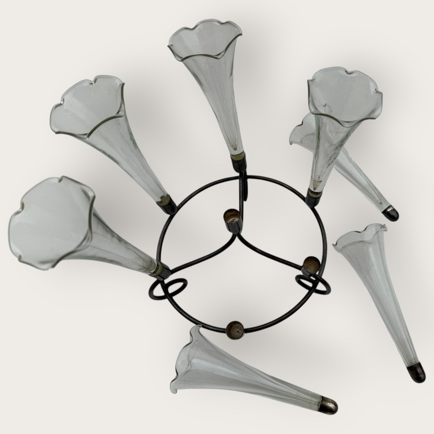 Epergne vase, Fint tyndt glas med flæsekant, alle vaser med sølvpletmontering, 7 vaser i art nouveau holder, ca. 19cm høj og 24cm i diameter, hver glasvase 13x5cm *Fin stand*Lager: 1