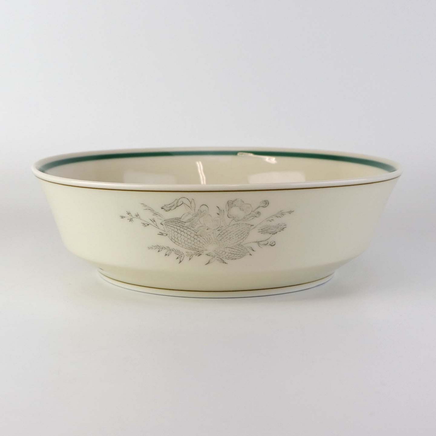 Service i glat cremefarvet porcelæn med grøn og sort kantstreg samt dekoration af blomster og grene i sort streg.