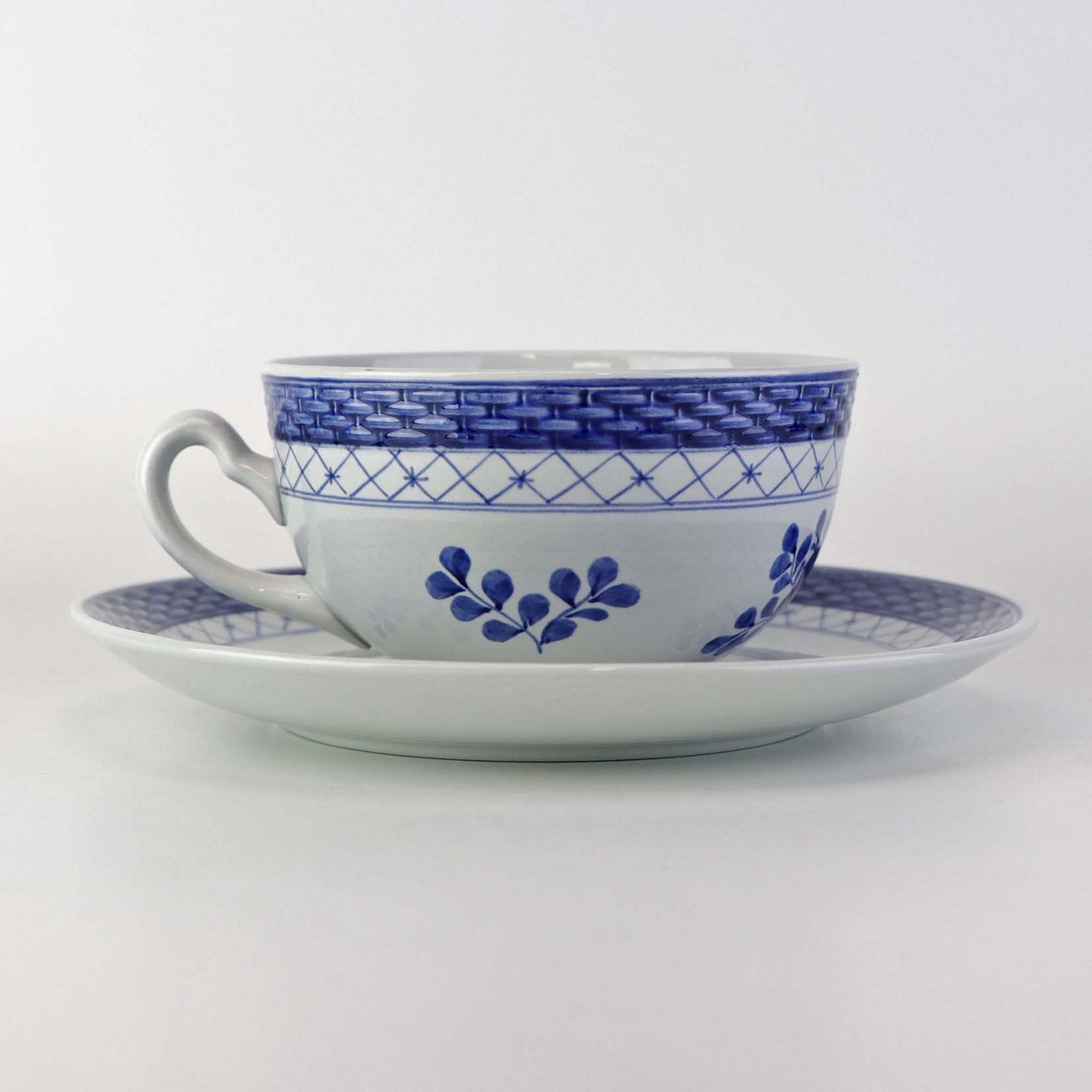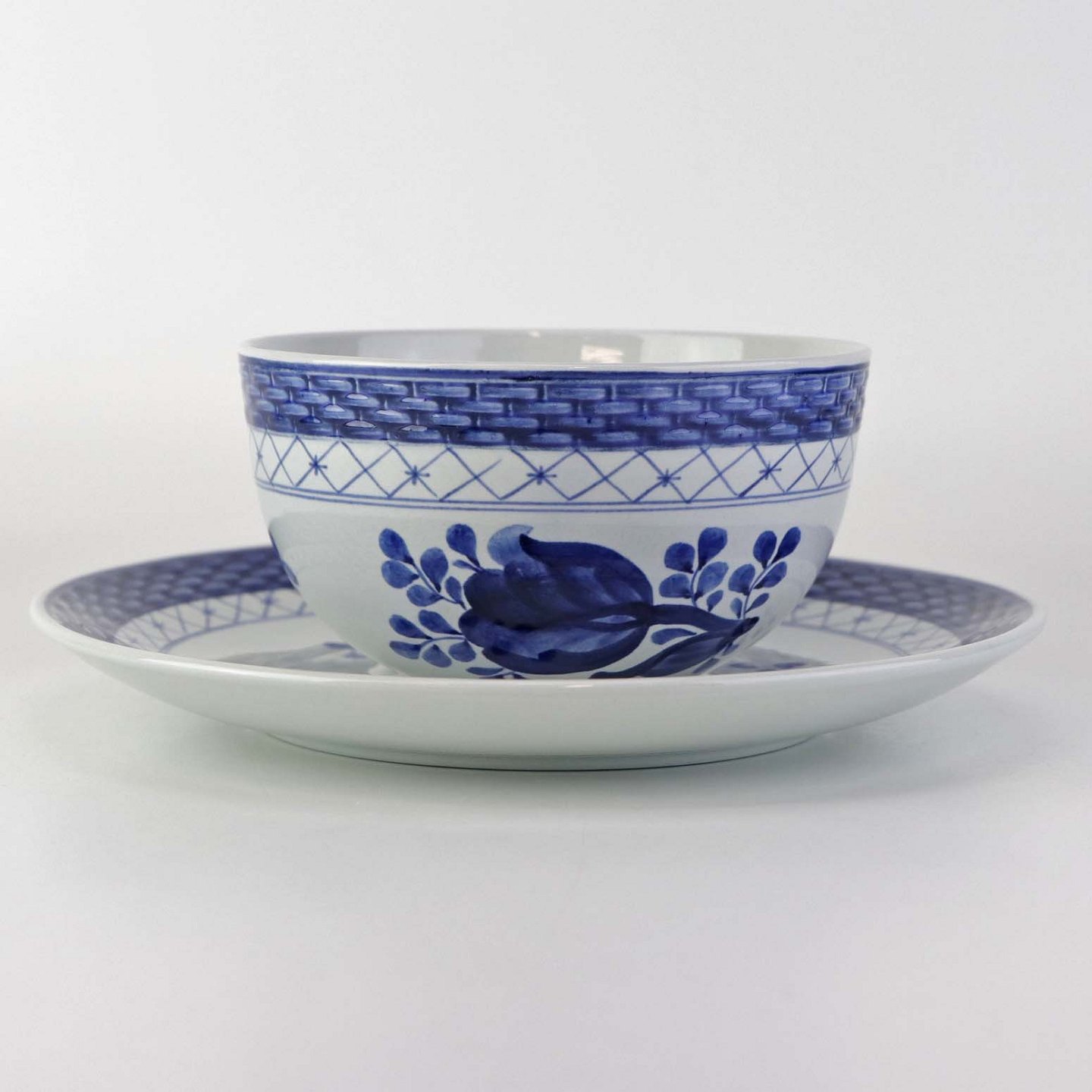 Glat Lyst fajance med blå dekoration af blomster og blå bort.
