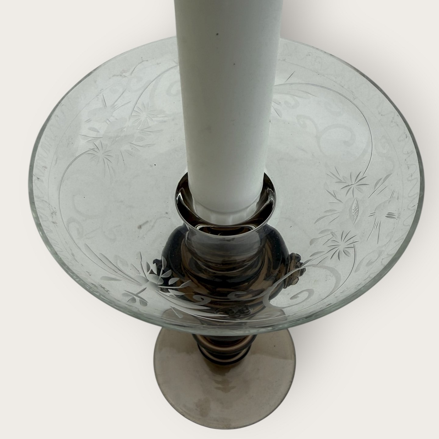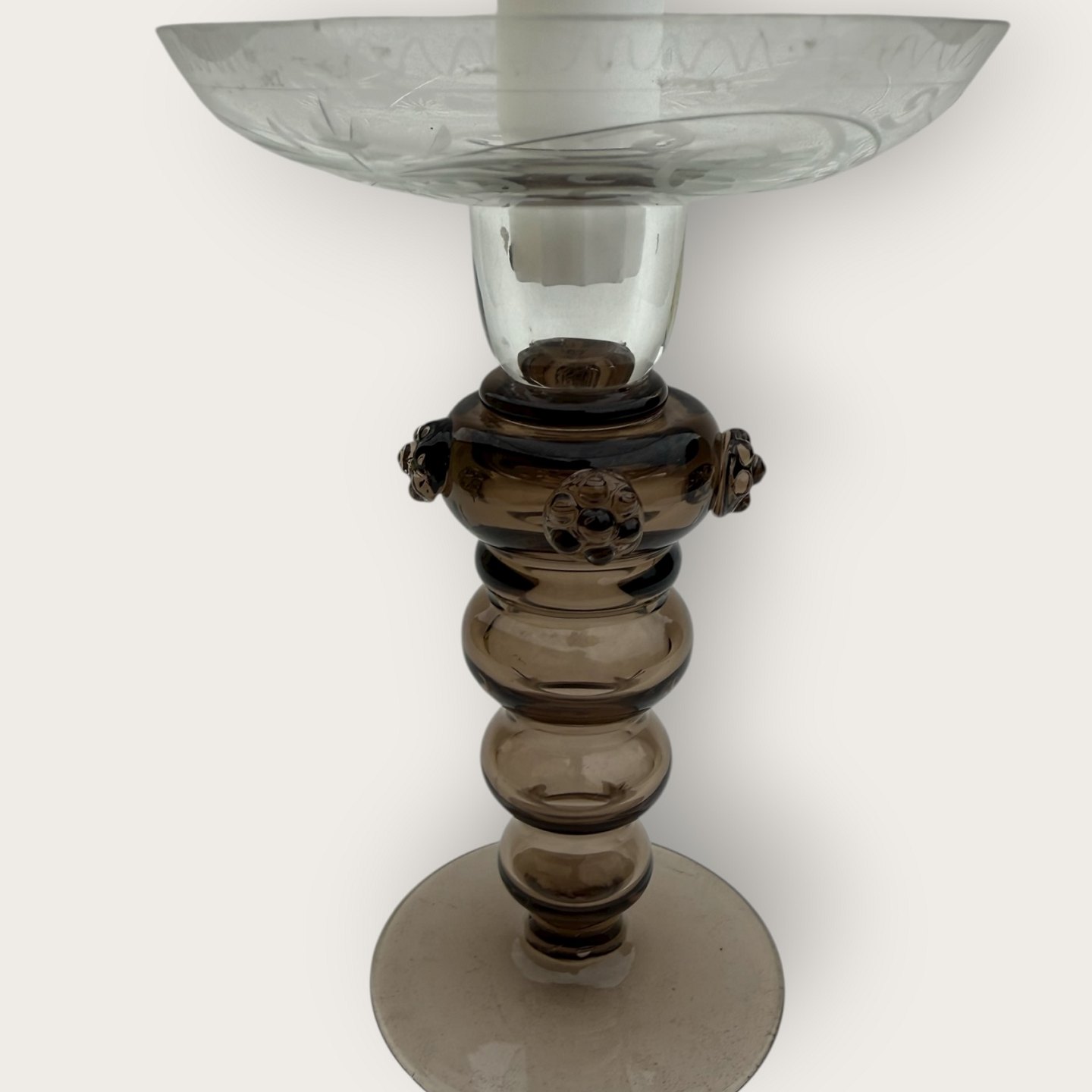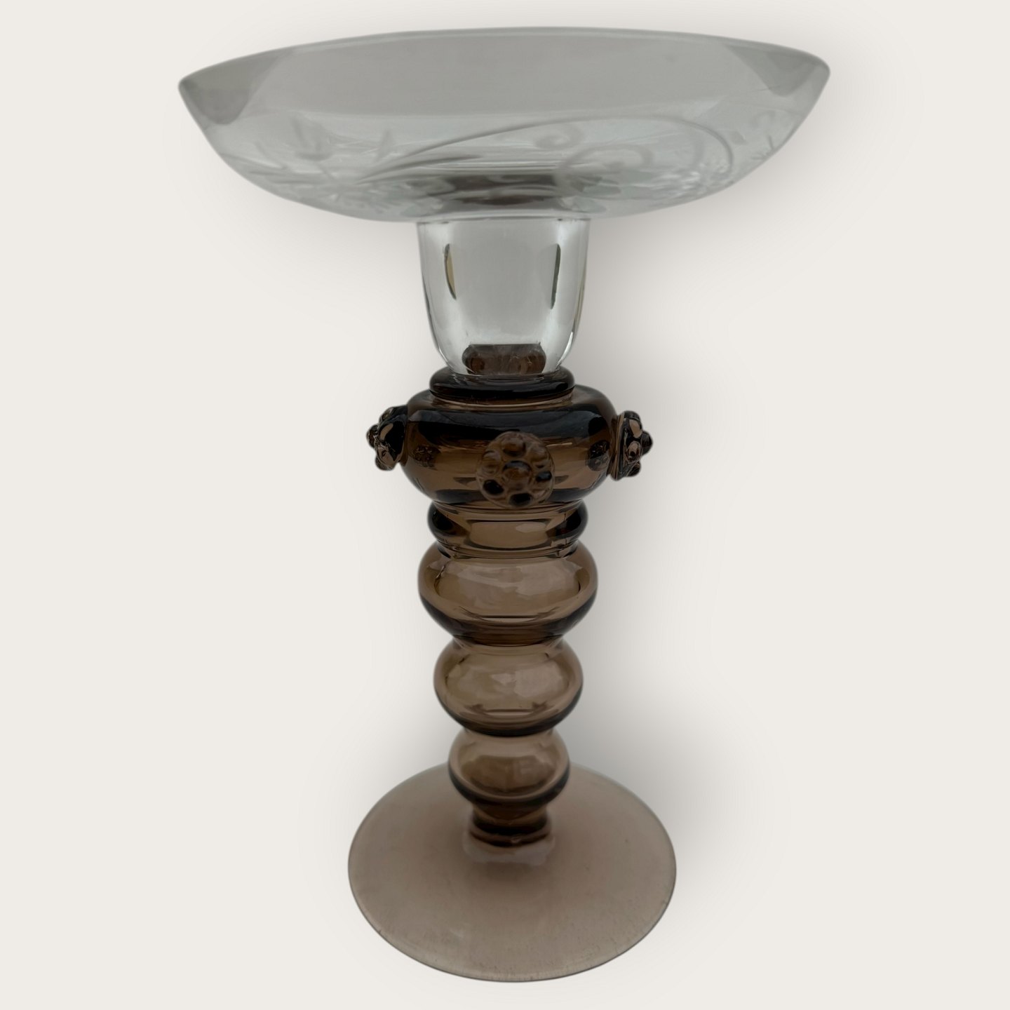 Gammel glaslysestage, hul brun stamme med rosetter, Skål med slibninger affugle, mønster og blomster, flot stand, højde 16,5cm, diameter 11cmLager: 1